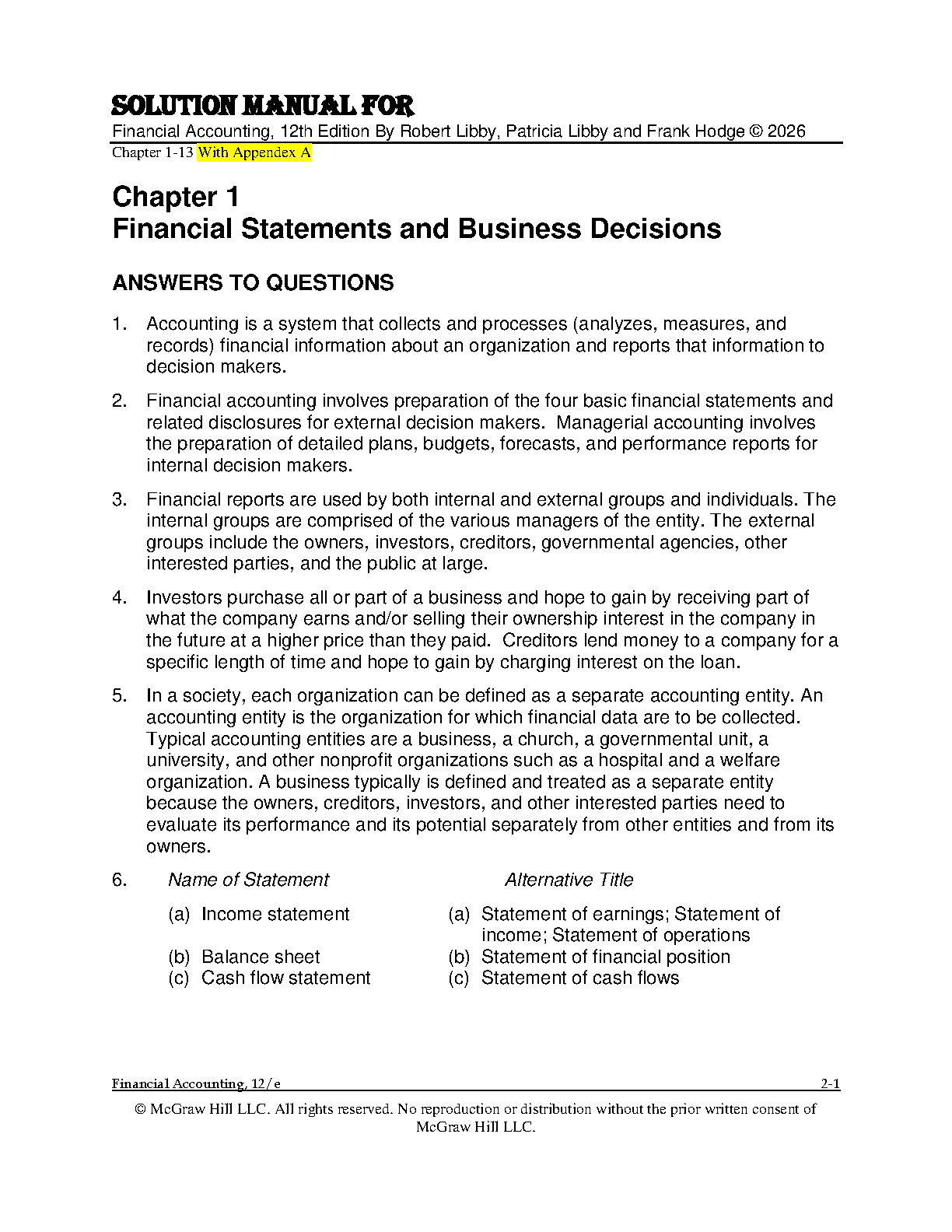 Unlock your full potential in accounting with this comprehensive Solution Manual for Financial Accounting, 12th Edition, authored by Robert Libby, Patricia Libby, and Frank Hodge. This guide provides meticulously detailed, step-by-step answers and explanations for all end-of-chapter questions, problems, and cases. It's the ultimate resource for students seeking to deepen their understanding, complete homework assignments accurately, and confidently prepare for exams. Instantly access this downloadable guide to master financial statements and business decision-making.