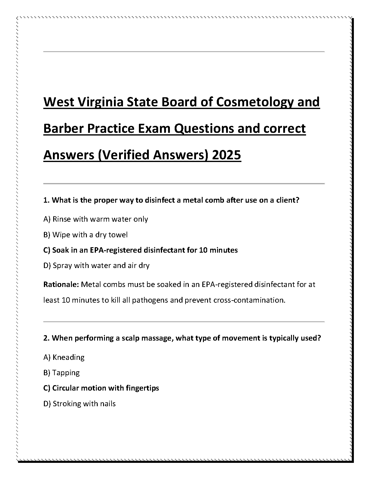 Ace your West Virginia State Board of Cosmetology and Barber licensing exam with our comprehensive 2025 test bank. This essential study guide features a complete collection of practice questions paired with verified answers and detailed rationales. Designed to mirror the actual state board exam format, this resource is your key to mastering all required topics, from sanitation procedures to practical techniques. Prepare confidently and walk into your exam ready to pass on the first try.