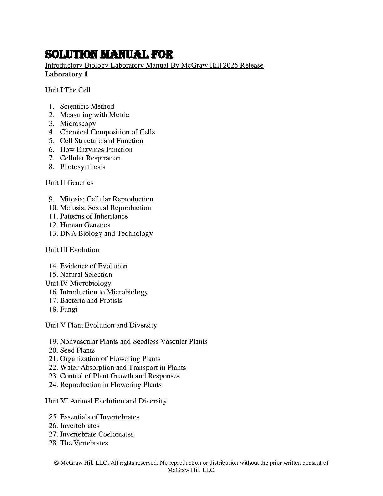 Unlock success in your biology lab with the definitive Solution Manual for the Introductory Biology Laboratory Manual, 2025 Edition, authored by Darrell S. Vodopich and Randy Moore. This indispensable guide offers complete, verified solutions and in-depth explanations for every chapter, from The Cell and Genetics to Plant and Animal Diversity. Published by McGraw Hill, this resource is expertly crafted to help you understand complex concepts, ace your assignments, and confidently prepare for exams. Get immediate access to the answers you need to excel in your biology course.