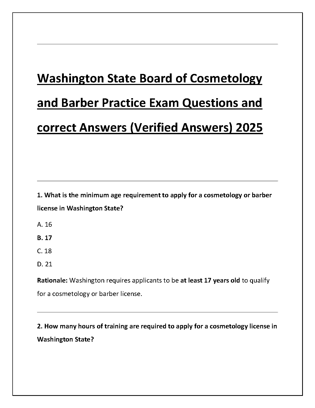 Washington State Board of Cosmetology and Barber Practice Exam 2025: Q&A Test Bank with Verified Answers