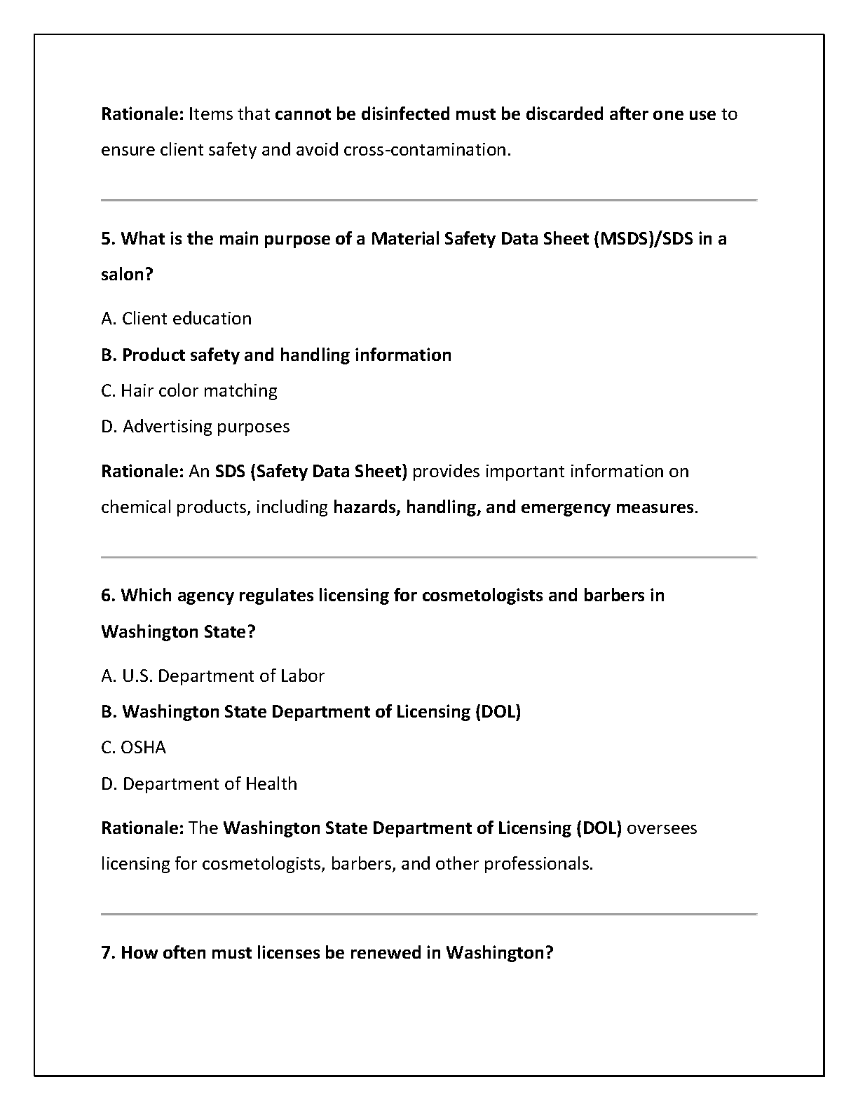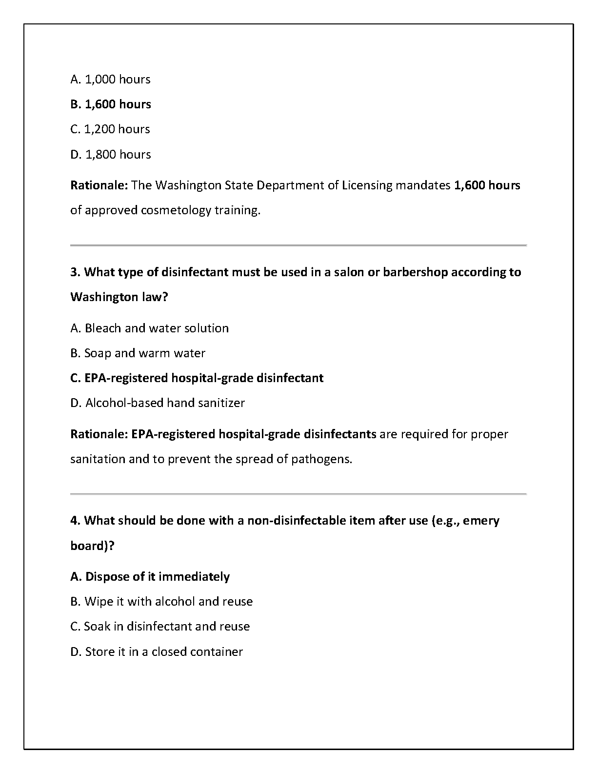 Ace your Washington State Board of Cosmetology and Barber licensing exam on your first try with our comprehensive 2025 test bank! This essential study guide features a complete set of practice questions meticulously compiled to mirror the actual exam. Each question comes with a verified, correct answer and a detailed rationale to deepen your understanding. Stop worrying about resits and start your career with confidence. Download now to get the ultimate preparation tool for the 2025 Washington Cosmetology and Barber exam.