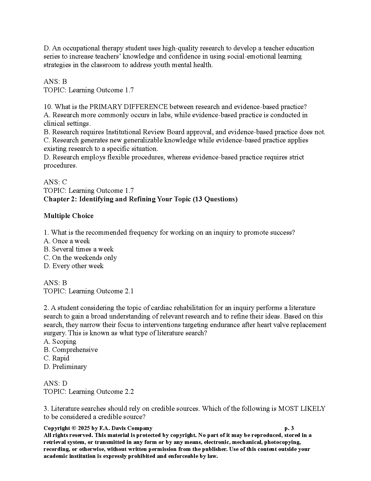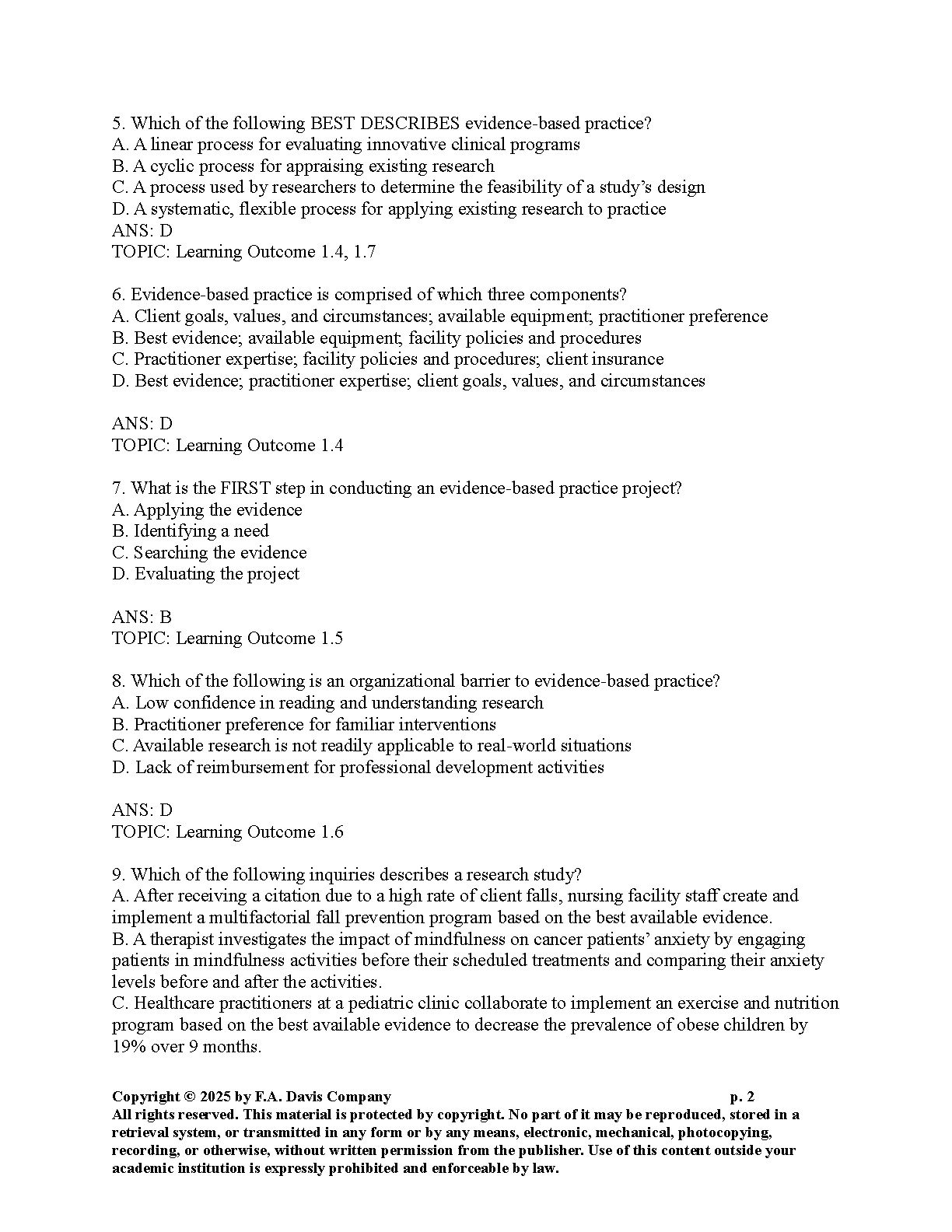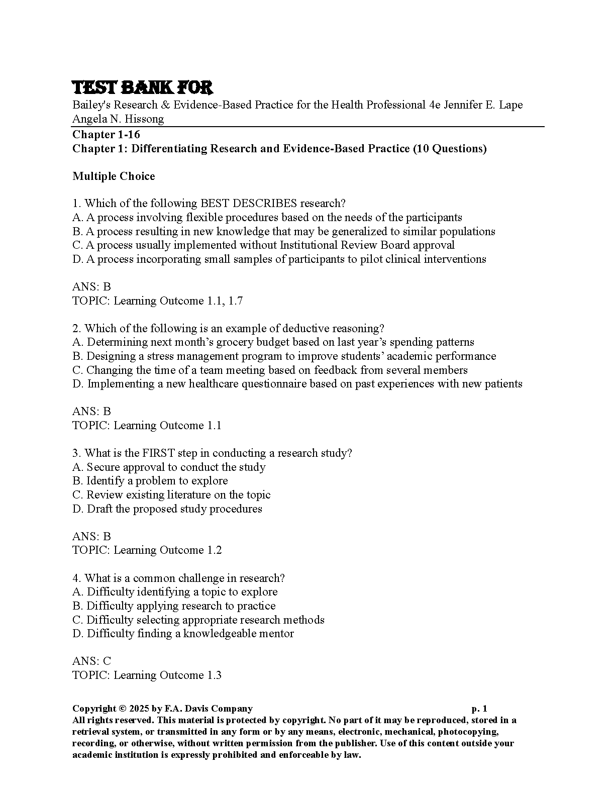 Unlock your full potential and master the concepts of healthcare research with the official 2025 Test Bank for Bailey's Research & Evidence-Based Practice for the Health Professional, 4th Edition. Authored by Jennifer E. Lape and Angela N. Hissong, this comprehensive resource provides a complete collection of exam-style questions and verified answers for every chapter (1-16). This test bank is the ultimate study companion, designed to help you thoroughly prepare for your exams, deepen your understanding of evidence-based practice, and achieve top grades.