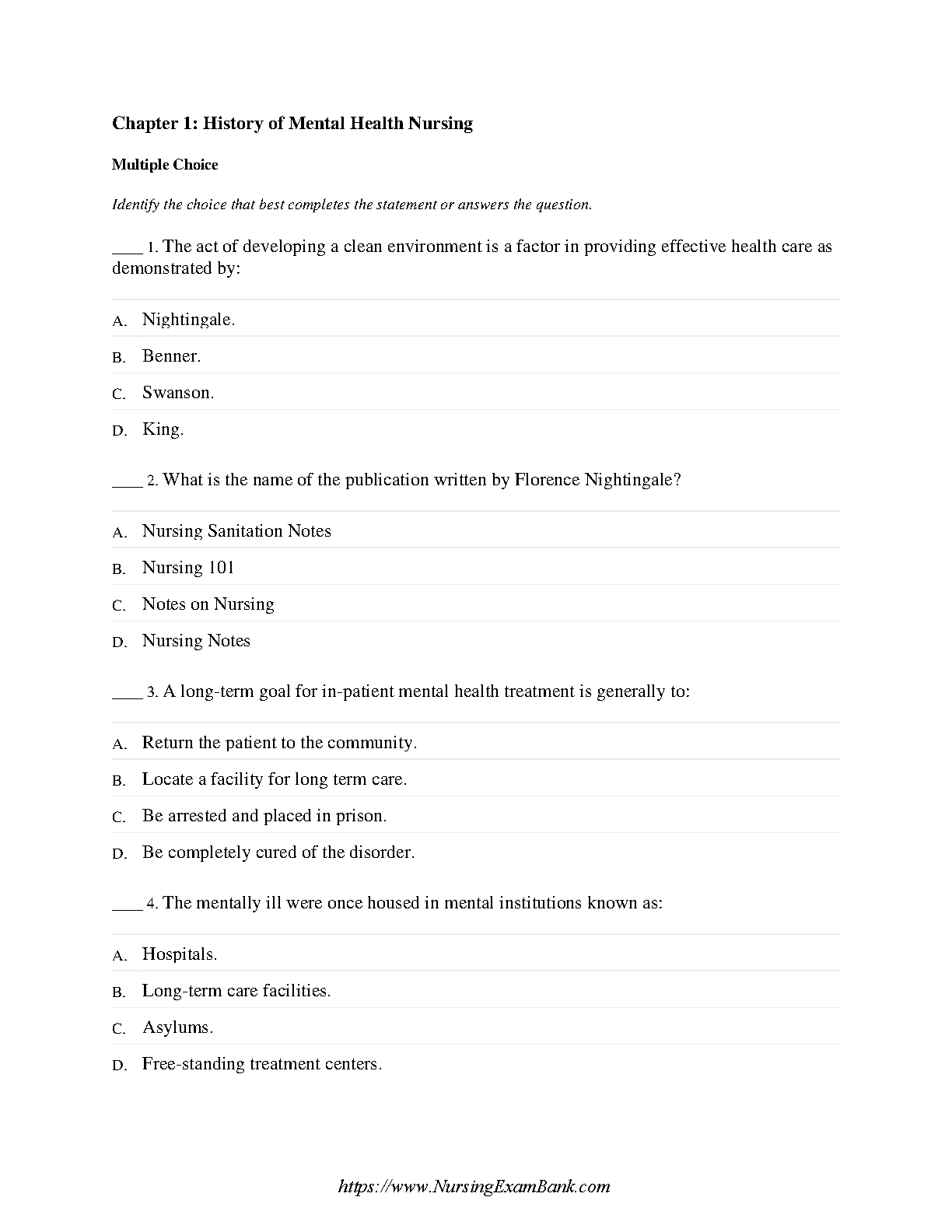 Gain a decisive edge in your studies with the official Test Bank for 'Mental Health Nursing,' 6th Edition, authored by Linda M. Gorman and Robynn F. Anwar. This essential study guide features a comprehensive collection of exam-style questions and detailed answers spanning all 22 chapters. From foundational topics like ethics and communication to critical areas such as depressive disorders, schizophrenia, and substance abuse, this resource is meticulously designed to deepen your understanding and boost your confidence. Prepare effectively, master complex concepts, and excel in your psychiatric nursing course with these expertly crafted practice materials.