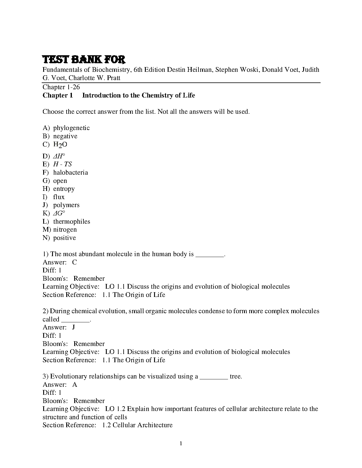 Test Bank for Fundamentals of Biochemistry, 6th Edition by Donald Voet, Judith G. Voet, Charlotte W. Pratt, Destin Heilman, and Stephen Woski