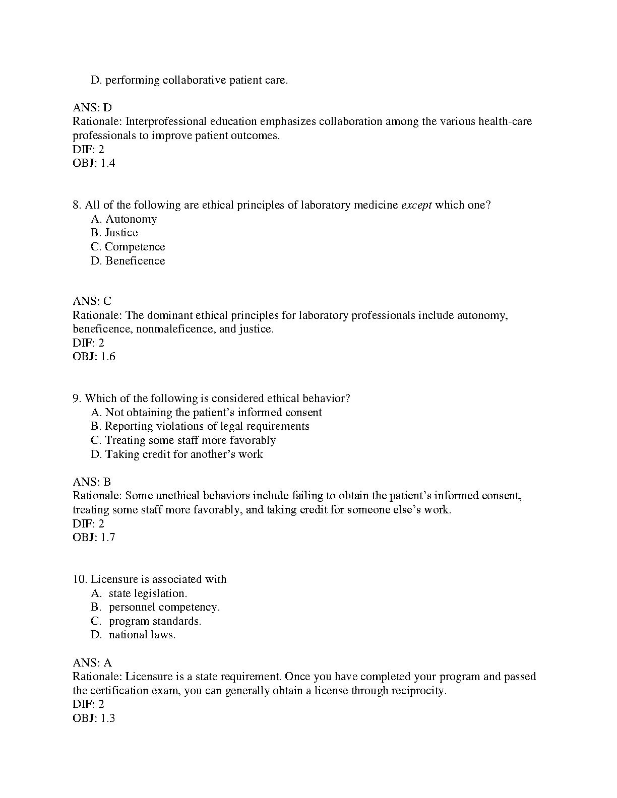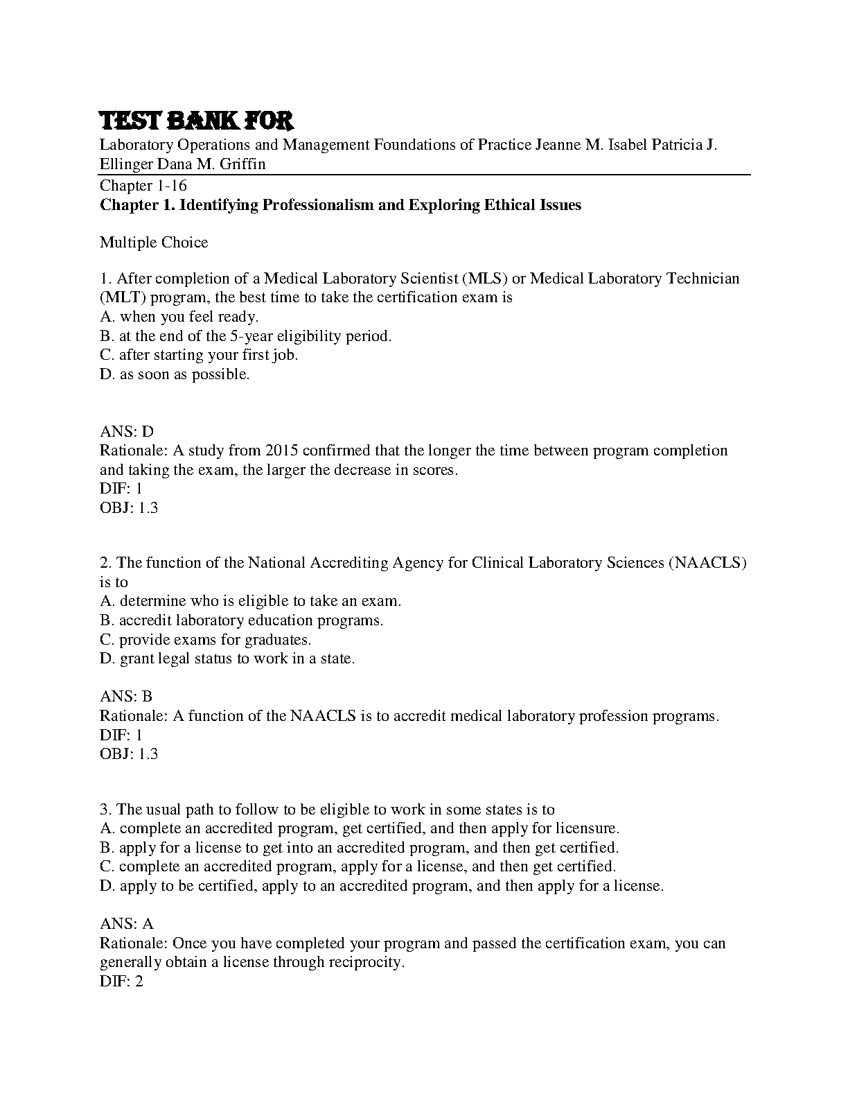 Master your course material and ace your exams with this complete, official Test Bank for 'Laboratory and Professional Skills for the Medical Laboratory Scientist, 1st Edition'. Authored by Jeanne M. Isabel, Patricia J. Ellinger, and Dana M. Griffin, this essential study resource covers all 16 chapters of the textbook. It features a comprehensive collection of multiple-choice questions, each paired with a correct answer and detailed rationale to deepen your understanding of key concepts, from professionalism and ethics to core laboratory operations. This test bank is the ultimate tool to test your knowledge, prepare effectively for exams, and build the confidence to succeed as a Medical Laboratory Scientist.