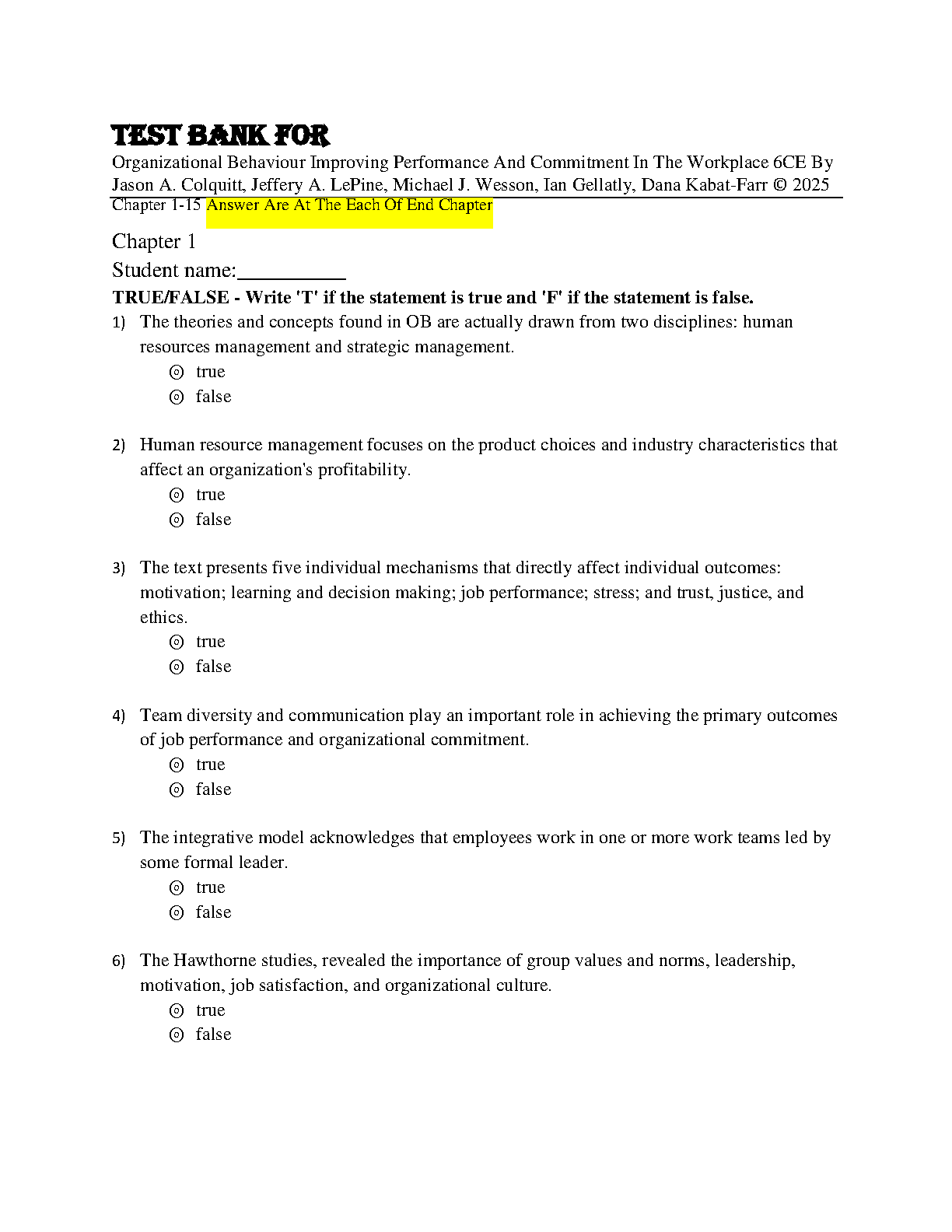 Test Bank for Organizational Behaviour: Improving Performance and Commitment in the Workplace, 6th Canadian Edition by Jason A. Colquitt, Jeffery A. LePine, Michael J. Wesson, Ian Gellatly, Dana Kabat-Farr