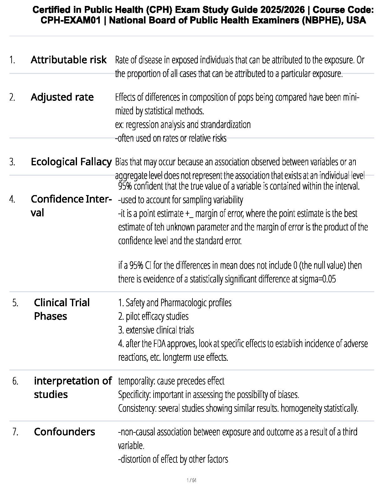 Ace your Certified in Public Health (CPH) exam on the very first try with our ultimate 2025/2026 study guide for course CPH-EXAM01. This meticulously compiled resource covers the complete NBPHE curriculum, breaking down complex topics like epidemiology, biostatistics, and public health principles into easy-to-understand definitions and explanations. Forget exam anxiety and the fear of resits. This guide is your roadmap to success, providing the crucial knowledge and confidence you need to become a certified public health professional. Get instant access to all 64 pages of expertly curated content and start your journey to passing the CPH exam today!