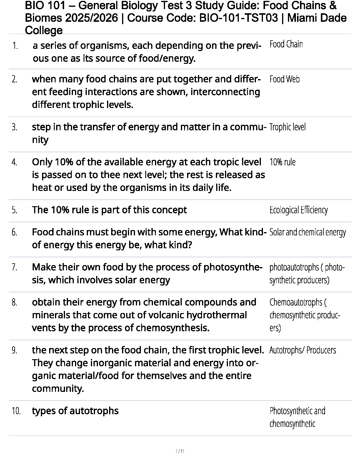 BIO 101 Test 3 Study Guide 2025/2026: Ace Food Chains & Biomes | Comprehensive Exam Elaboration for Miami Dade College Students