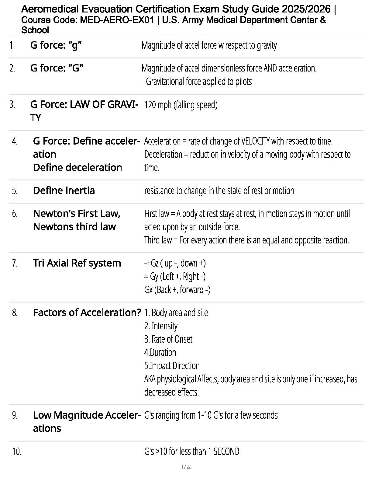 Master the material for your Aeromedical Evacuation Certification with our latest 2025/2026 study guide for course MED-AERO-EX01. This in-depth resource, based on materials from the U.S. Army Medical Department Center & School, provides clear, concise answers to all potential exam questions. Dive into crucial topics such as G-force dynamics, laws of motion, acceleration factors, and more. This guide is your key to understanding complex concepts and is structured to help you pass the certification exam confidently on your first try. Don't risk a resit—prepare effectively with this essential study tool.