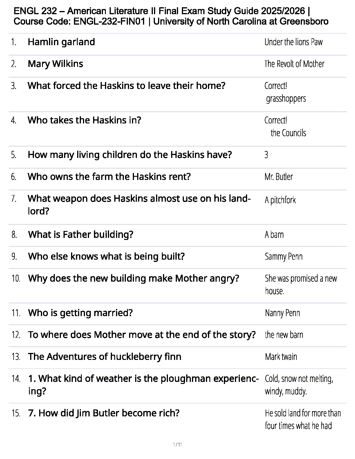 Unlock exam success in ENGL 232 American Literature II with this comprehensive final exam study guide for the 2025/2026 academic year. Tailored for students at the University of North Carolina at Greensboro, this guide provides a detailed Q&A format covering essential works by authors like Hamlin Garland, Mary Wilkins Freeman, and Mark Twain. Master key plot points, character motivations, and thematic elements to confidently pass your final exam on the first try. This is the perfect resource to avoid resits and achieve an excellent grade.