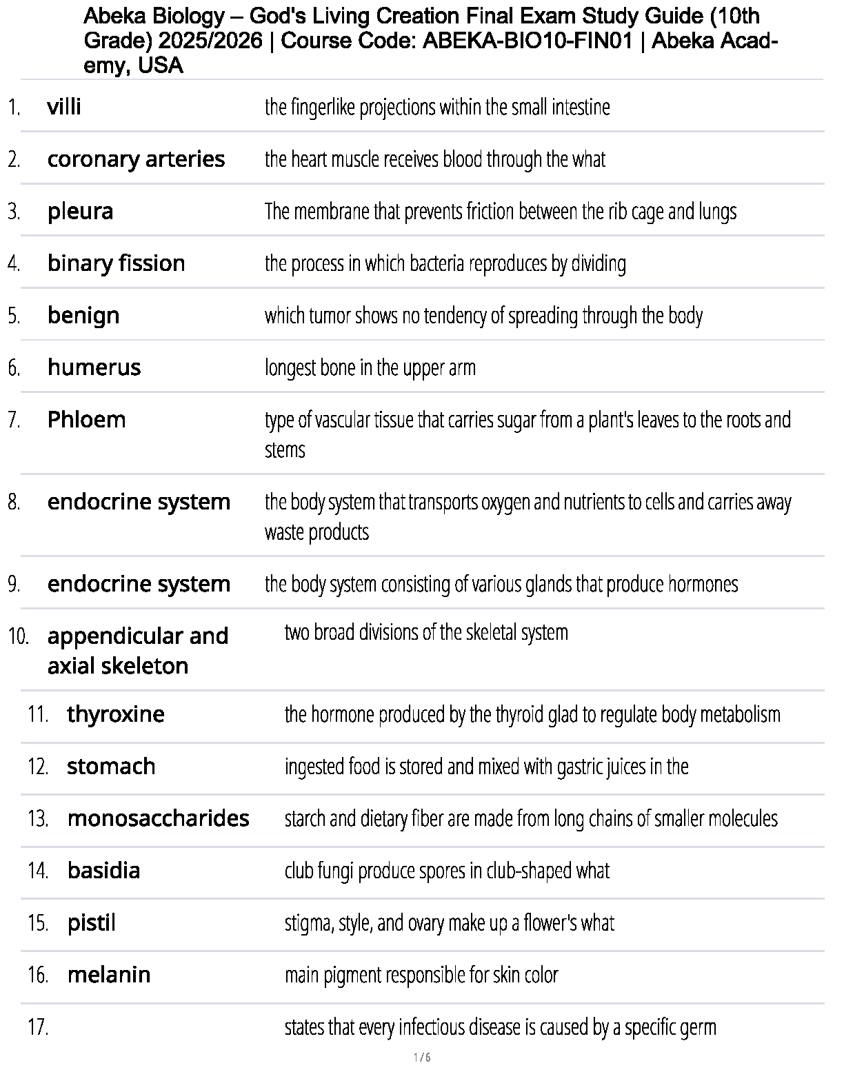 Struggling with your 10th-grade Abeka Biology final? This comprehensive Final Exam Study Guide for 'God's Living Creation' is your ultimate resource for the 2025/2026 academic year. Aligned with the 5th Edition by Laurel Hicks and the ABEKA-BIO10-FIN01 course, it provides clear, concise definitions for all key terms and concepts you need to know. From the endocrine system to plant phloem, this guide is expertly designed to help you ace your exam on the first attempt and avoid any resits. Secure your success in biology today!