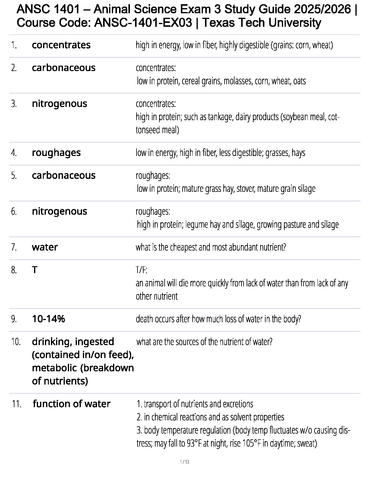 Excel in your Animal Science course at Texas Tech University with this comprehensive study guide for ANSC 1401 Exam 3. This guide is fully updated for the 2025/2026 academic year and is designed to help you pass your exam on the first try. It provides detailed, easy-to-understand explanations of crucial topics, including the classification and properties of concentrates and roughages (both carbonaceous and nitrogenous), the essential functions of water, and other key nutrient concepts. Master the material efficiently and walk into your exam with confidence. Avoid the stress of resits by using this targeted resource to secure a top grade.