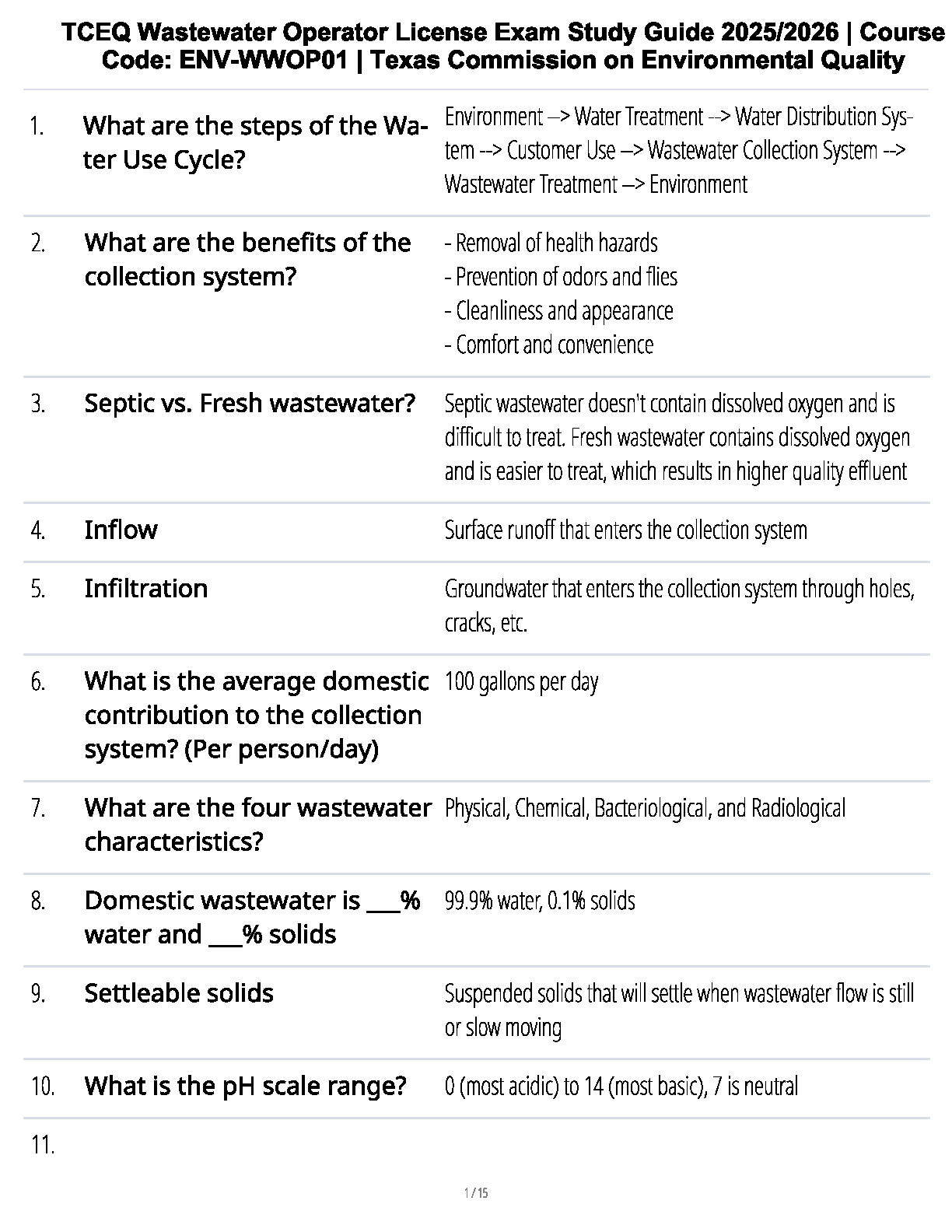 Prepare to ace your Texas Wastewater Operator License Exam with our latest 2025/2026 study guide for course ENV-WWOP01! This comprehensive resource, developed in line with the Texas Commission on Environmental Quality (TCEQ) standards, is your ultimate tool for success. Featuring a detailed Q&A format, it covers all critical topics, including the water use cycle, wastewater characteristics, collection systems, and key terminology. Designed specifically to help you pass on your first attempt, this guide simplifies complex concepts, making your study sessions more effective and ensuring you walk into the exam with confidence. Avoid resits and fast-track your certification with this essential exam preparation material.