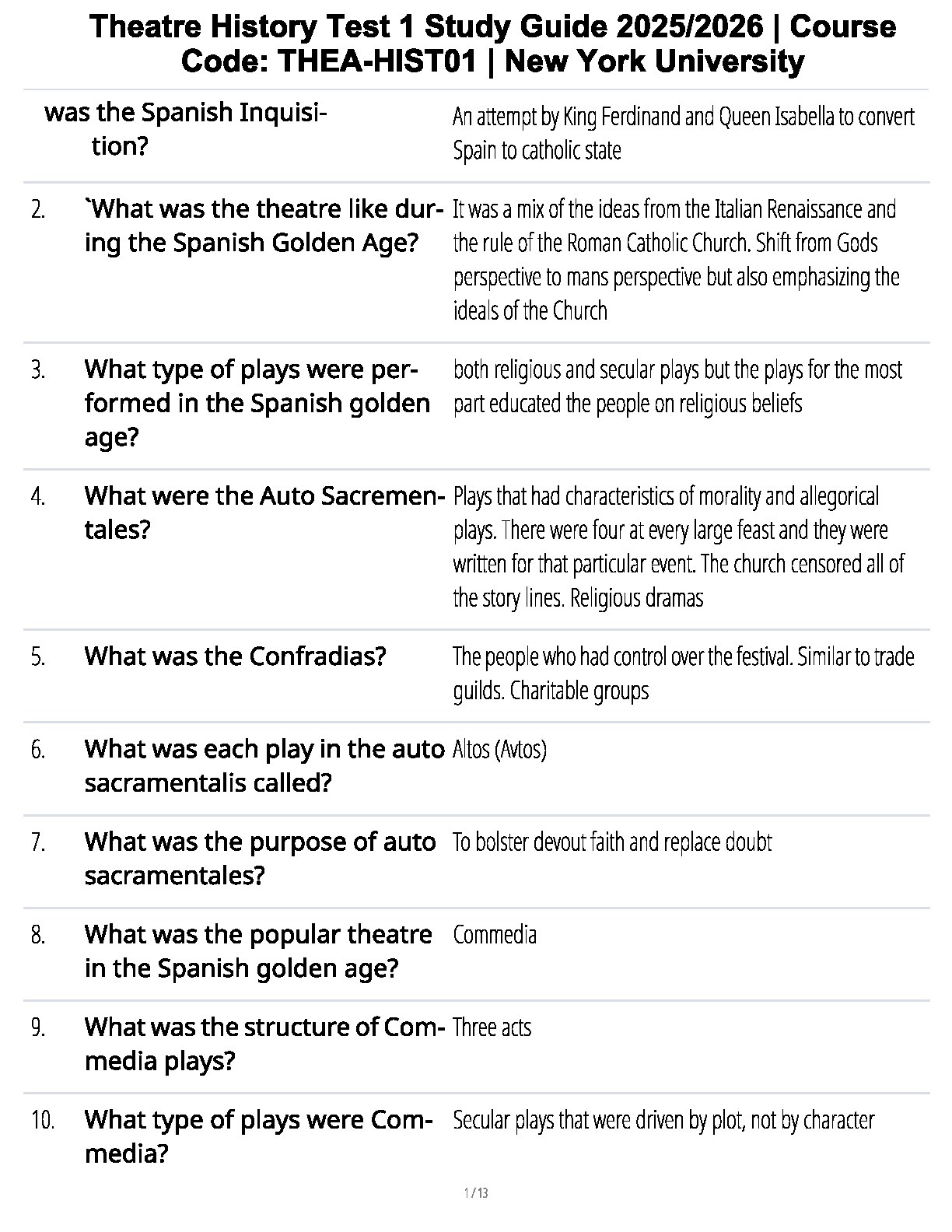 Master the fundamentals of Theatre History with this essential Test 1 study guide for THEA-HIST01 at New York University. This up-to-date 2025/2026 resource is expertly crafted to ensure you pass your exam with confidence on the very first try. Spanning 13 pages, this guide utilizes an easy-to-follow Q&A format, breaking down complex topics like the Spanish Golden Age, the nuances of Auto Sacramentales, and the structure of Commedia. Get the precise answers you need to excel in your course and avoid any resits. Download now for immediate access to your study solution!