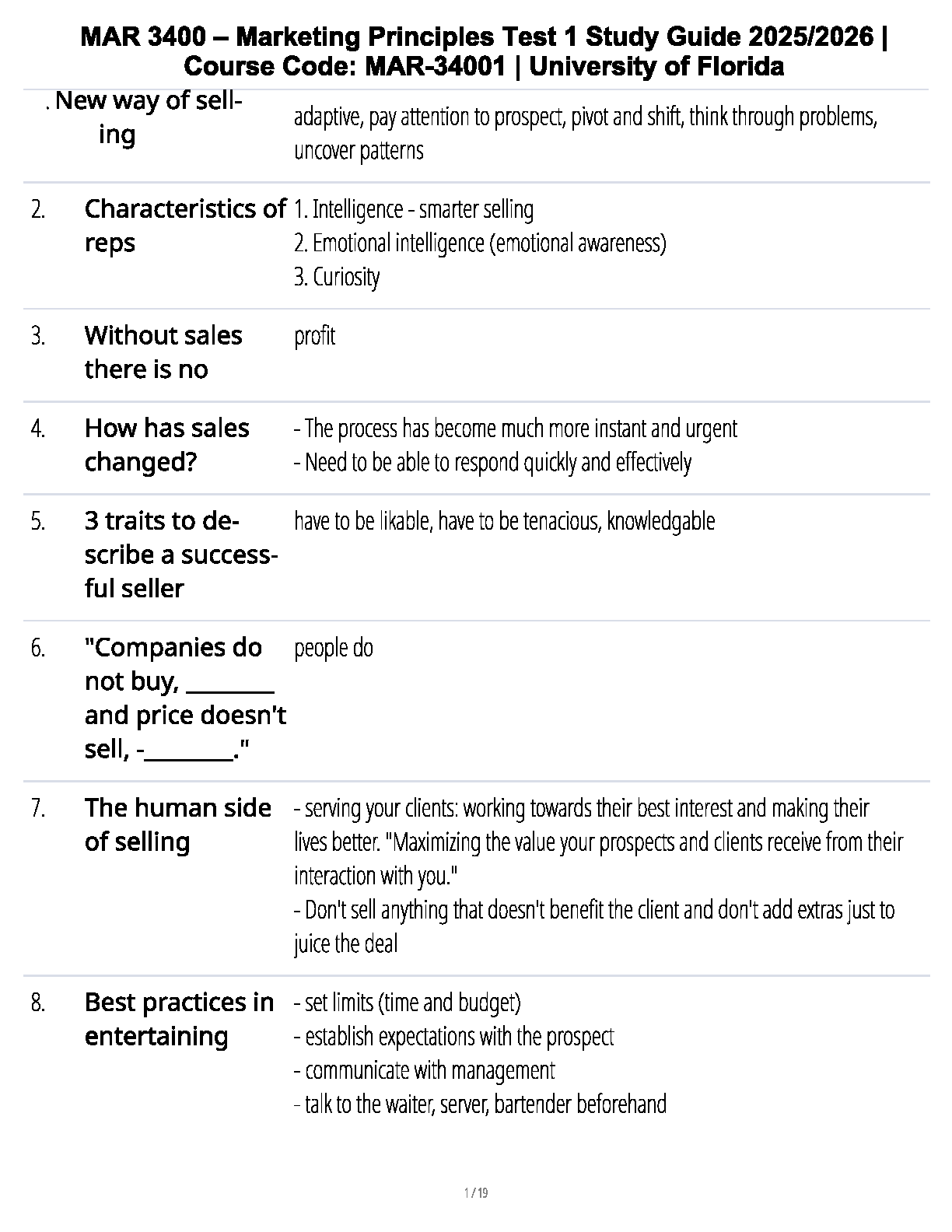 Struggling with MAR 3400 Marketing Principles at the University of Florida? Our comprehensive Test 1 Study Guide for the 2025/2026 academic year is expertly designed to help you master the core concepts and ace your exam without needing a resit. This detailed guide covers all essential topics for Test 1, from the new adaptive ways of selling and the key characteristics of successful sales reps to the human side of selling and best practices for client entertainment. With clear, concise answers and key points, this resource is your key to understanding complex topics, preparing effectively, and passing your exam on the very first attempt. Download now and secure your success in Marketing Principles!