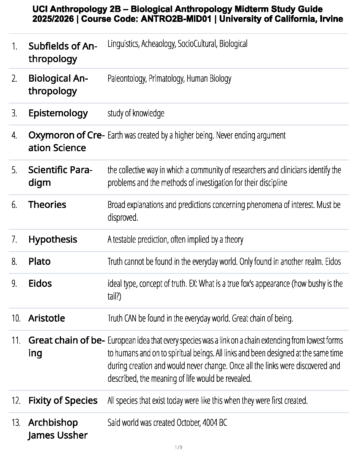 Master your UCI Biological Anthropology midterm with this essential 2025/2026 study guide for ANTRO2B. This comprehensive resource breaks down all the crucial concepts and key terminology you need to know, from the core subfields of anthropology and the scientific paradigm to foundational ideas from Plato and Aristotle. Designed to help you ace your exam on the first try, this guide provides clear, concise definitions and explanations, ensuring you grasp the material thoroughly. Stop stressing and start studying smart with this ultimate prep tool, perfectly tailored for students at the University of California, Irvine.