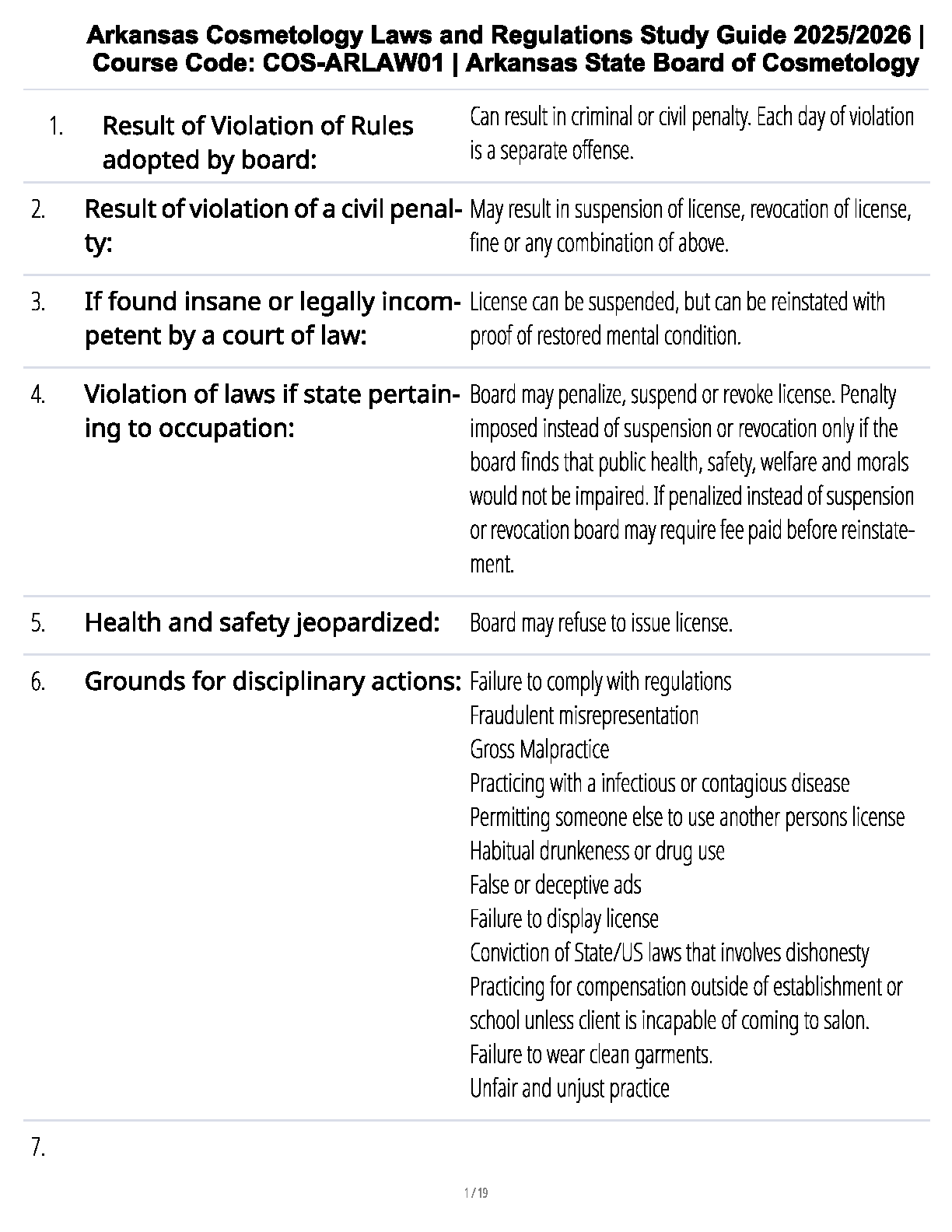 Master the essential legal and regulatory knowledge needed to ace your Arkansas State Board of Cosmetology exam with our comprehensive 2025/2026 study guide for course COS-ARLAW01. This detailed resource breaks down complex topics, including the results of violating rules, grounds for disciplinary action, and health and safety standards. Meticulously updated for the current academic year, this guide is your key to understanding the official requirements and passing your licensure exam on the first attempt, securing your professional future without the stress of resits.