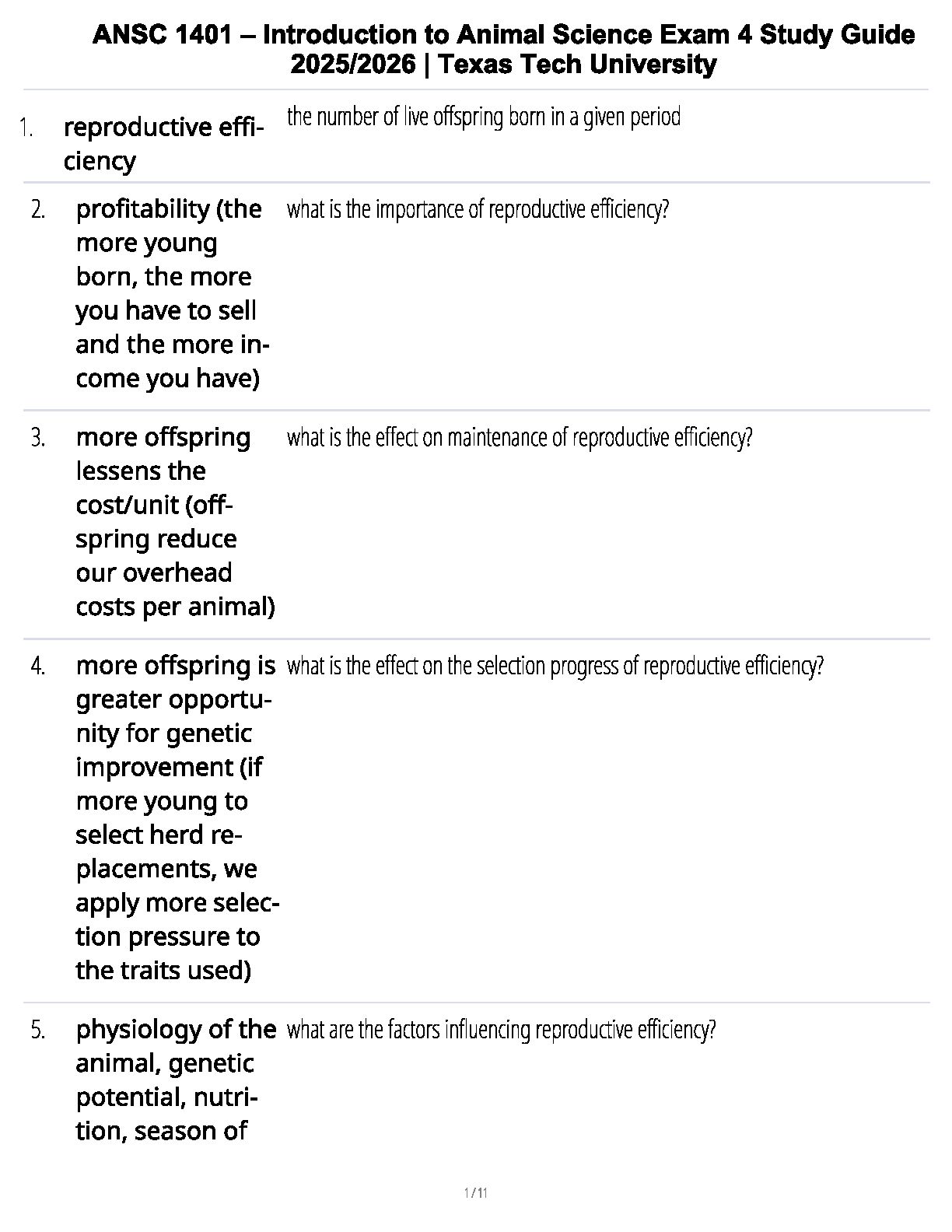 Master the crucial topics for your ANSC 1401 Exam 4 at Texas Tech University with this expertly prepared 2025/2026 study guide. This resource provides clear, concise answers on key concepts such as reproductive efficiency, its economic importance, and its role in genetic improvement. It's the ultimate tool designed to help you confidently face your exam, achieve a high score, and pass successfully on your first try. Avoid resits and secure your grade with this essential study aid.