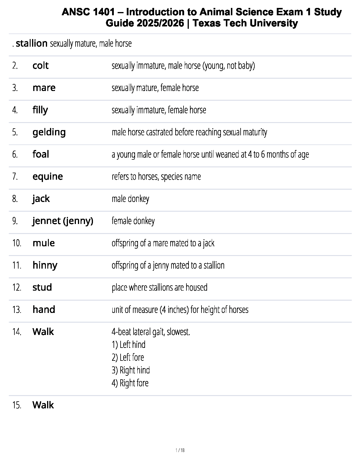 Dominate your ANSC 1401 Exam 1 at Texas Tech University with this brand-new 2025/2026 study guide. This comprehensive resource covers all the crucial terminology and concepts from Introduction to Animal Science, ensuring you have everything you need to study effectively, avoid resits, and secure a top grade on your first attempt.