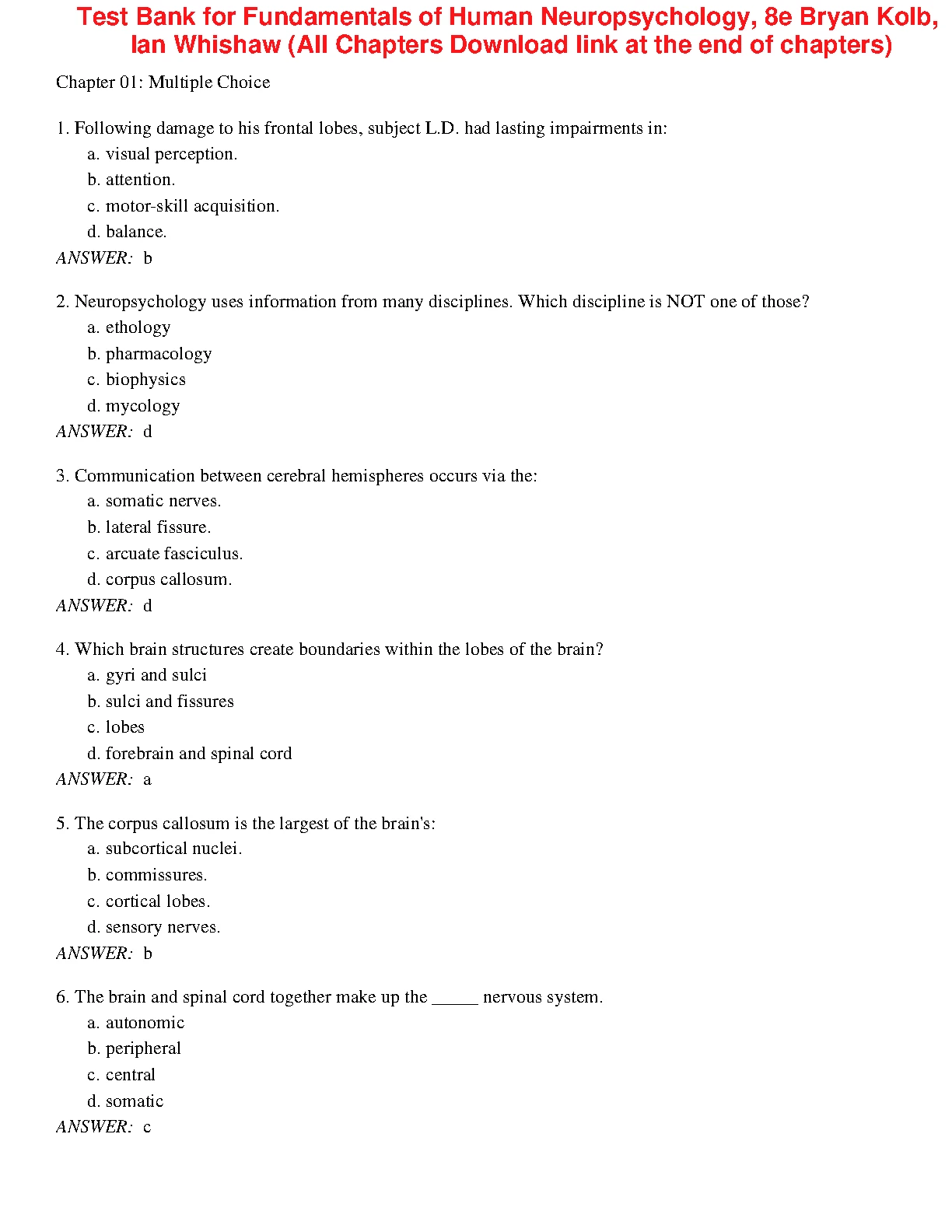 Test Bank for Fundamentals of Human Neuropsychology, 8TH EDITION BY Bryan Kolb, Ian Whishaw (All Chapters)