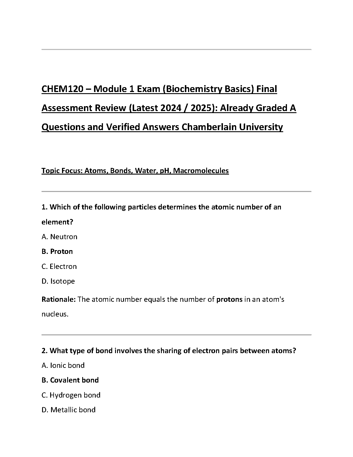 Ace your CHEM120 Module 1 exam at Chamberlain University with this comprehensive test bank for the 2025/2026 academic year. This essential study guide features a complete collection of already A-graded questions with verified answers and detailed rationales, focusing on key topics like Atoms, Bonds, Water, pH, and Macromolecules. Master the core concepts of Biochemistry Basics and confidently pass your exam on the first attempt, avoiding costly resits. Download now to secure your top grade!