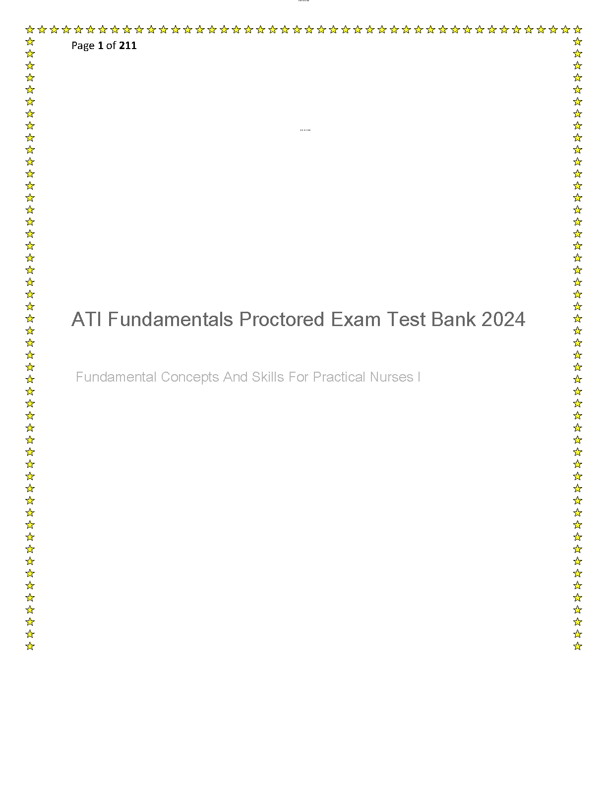 Unlock your potential and excel in your nursing studies with the complete 2024 Test Bank for the ATI Fundamentals Proctored Exam. This essential resource, tailored for the 'Fundamental Concepts and Skills for Practical Nurses' curriculum, provides an extensive collection of exam-style questions, detailed answers, and expert rationales. Master core nursing principles, enhance your critical thinking, and build the confidence needed to pass your proctored exams and the NCLEX-PN on your first attempt. Start studying smarter, not harder, and secure your success today.