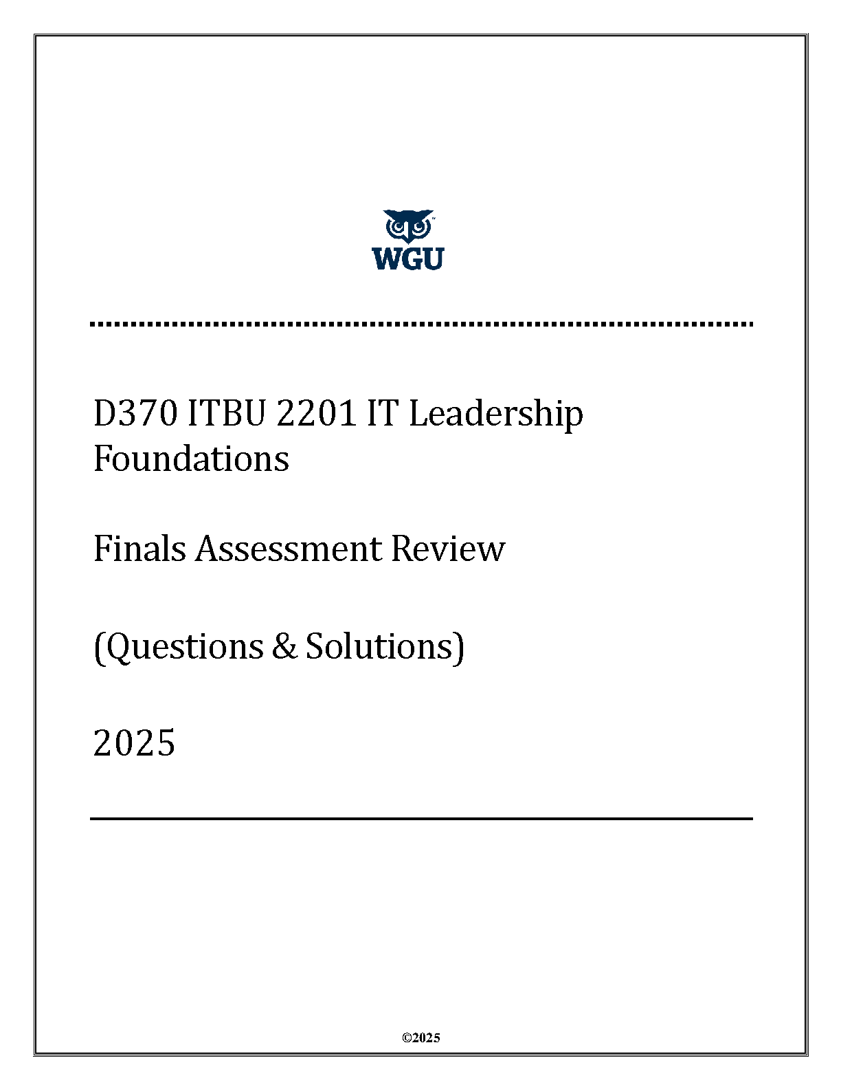 Master the WGU D370 IT Leadership Foundations course with our latest 2025/2026 Finals Assessment Review. This all-inclusive study guide provides a complete set of questions and detailed solutions, covering all critical topics you'll face on the final exam. Designed to ensure you grasp key concepts in IT management, strategic leadership, and team dynamics, this resource is your ultimate tool for passing the assessment on your very first attempt. Stop worrying about resits and confidently prepare for success!