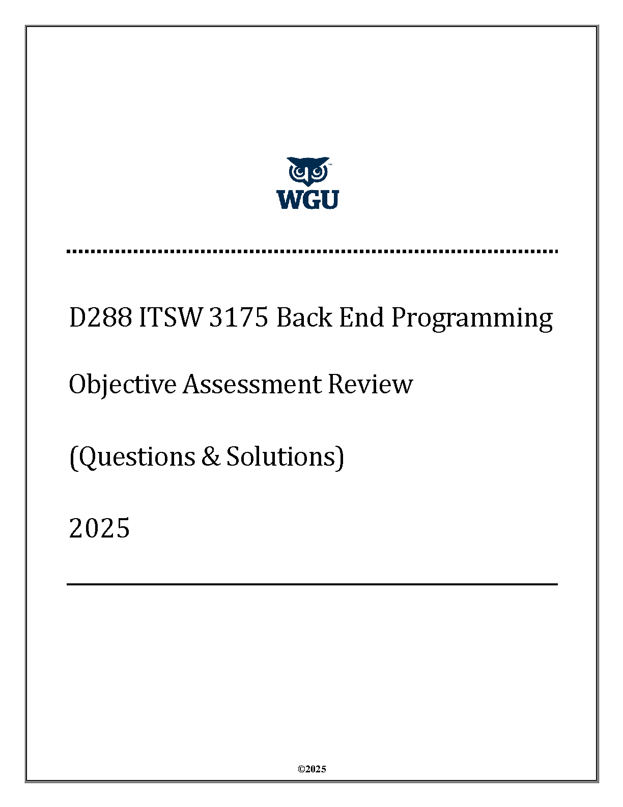 Ace your WGU D288 Back End Programming Objective Assessment on the first try with our comprehensive 2025/2026 review guide. This resource for ITSW 3175 provides a complete set of questions and detailed, verified solutions, mirroring the actual exam format. Stop worrying about resits and master the key concepts of back-end development. Download now and confidently prepare to pass your assessment!