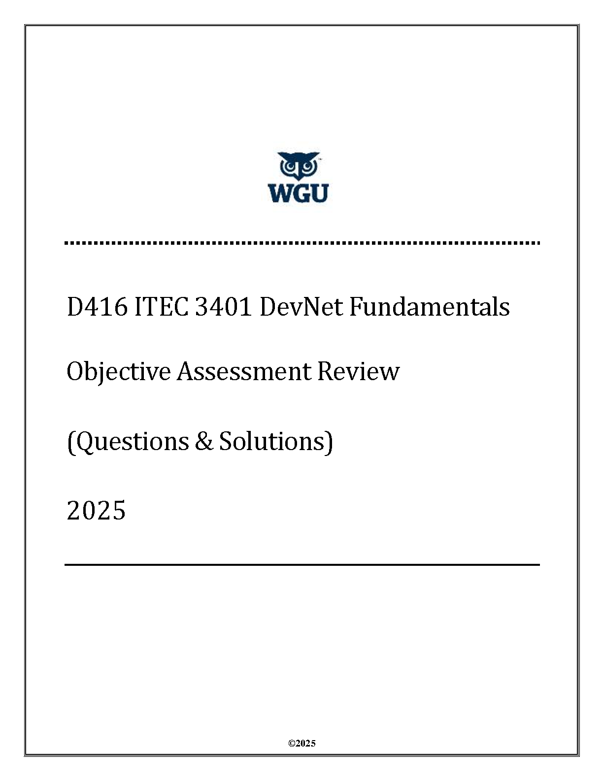 Ace your WGU D416 ITEC 3401 DevNet Fundamentals exam on the first try with our latest 2025 Objective Assessment Review guide. This comprehensive resource provides a complete set of questions and detailed solutions, covering all key topics you'll face in the final assessment. Master concepts in network automation, programmability, and software development for networks. This study guide is your ultimate tool to avoid resits, build confidence, and secure a top grade in your DevNet Fundamentals course. Download now for immediate access to the study materials you need for success in the 2025/2026 academic year.