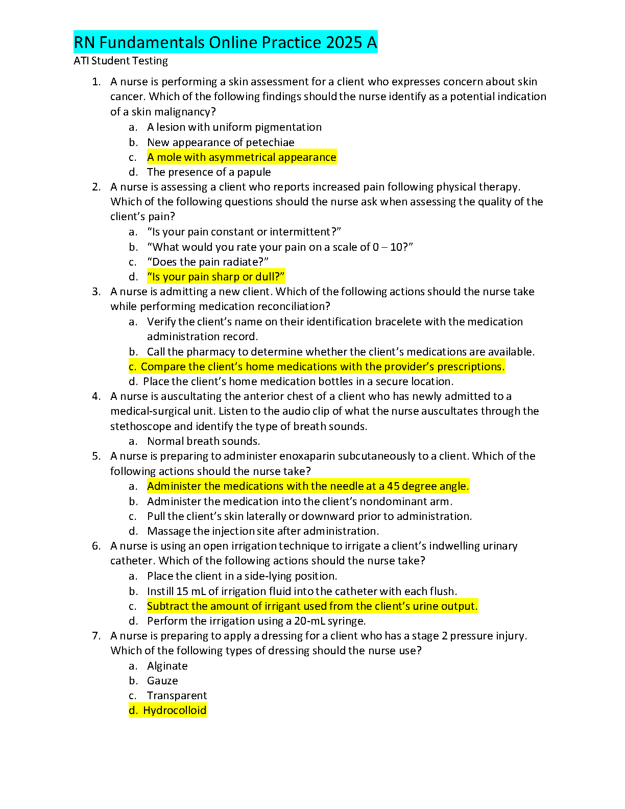 ATI RN Fundamentals Online Practice Test A 2025/2026: Verified Questions & Answers Study Guide to Pass on Your First Try