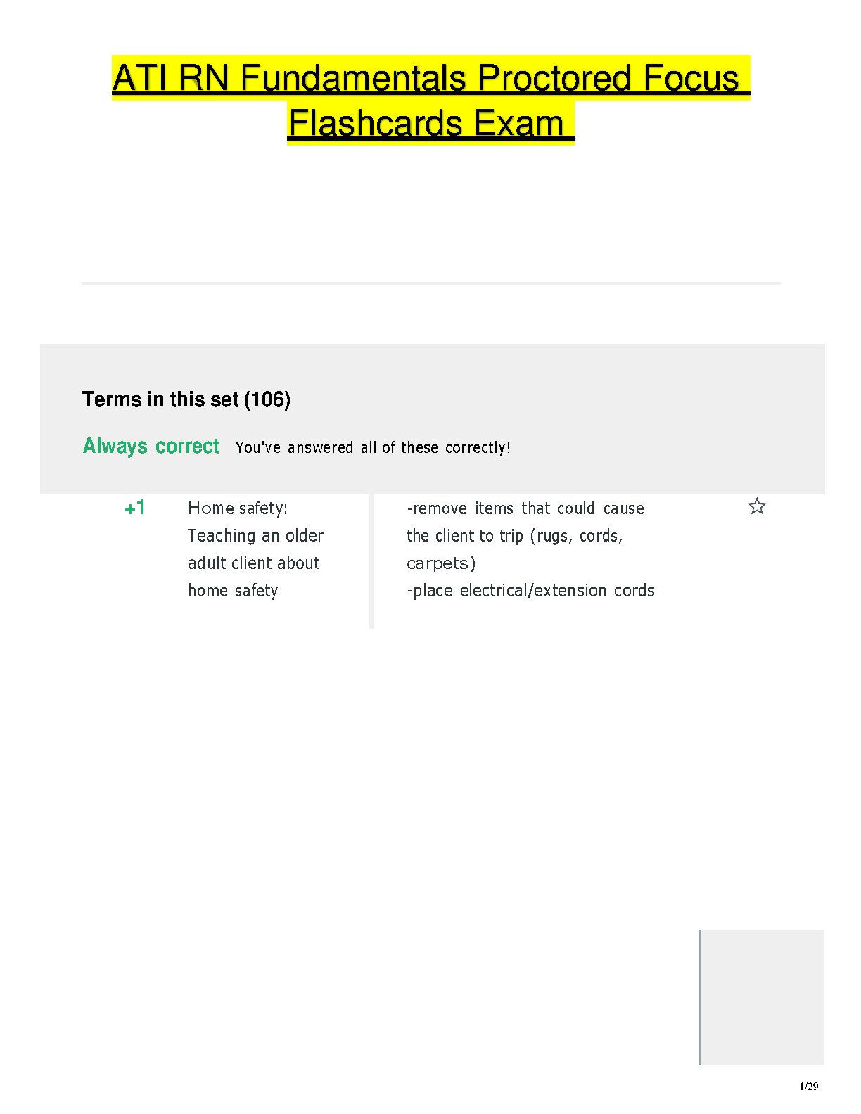 Excel in your nursing studies with our comprehensive ATI RN Fundamentals Proctored Focus Flashcards Exam guide for the 2025/2026 academic year. This essential resource features 106 meticulously crafted flashcards covering all critical topics, such as patient safety, health promotion, and basic care. Designed to streamline your study process and boost your confidence, this guide is your key to mastering the fundamentals and passing the ATI proctored exam on your first attempt, avoiding costly resits. Get ready to ace your exam with this targeted and easy-to-use study aid.