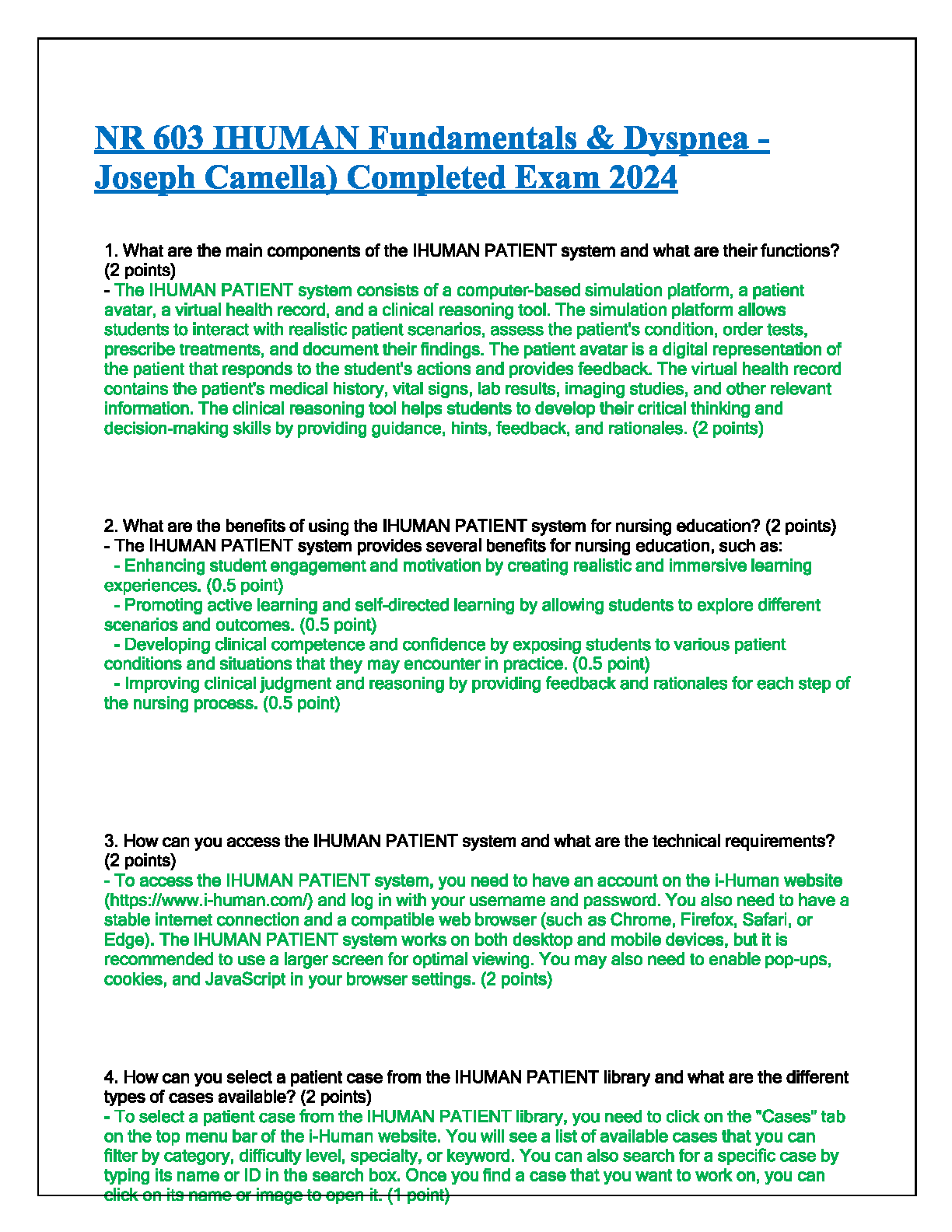 Ace your NR 603 course with our comprehensive study guide for the iHuman Joseph Camella case study, focusing on Fundamentals and Dyspnea. This latest 2025/2026 resource features a complete set of exam questions paired with detailed, verified answers. It is meticulously designed to help you master the iHuman simulation, develop critical clinical reasoning, and confidently pass your exam on the very first attempt. Avoid resits and gain the knowledge needed to excel in your nursing studies. Download now for immediate access.