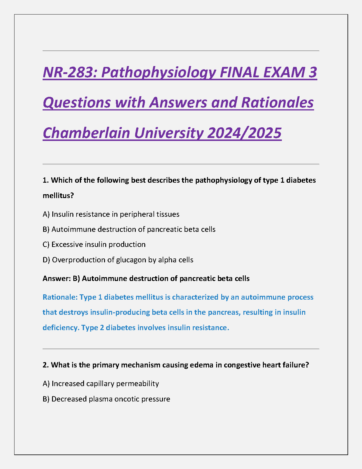 NR 283 Pathophysiology Final Exam 3: 2024-2025 Test Bank with Verified Q&A and Rationales | Chamberlain University