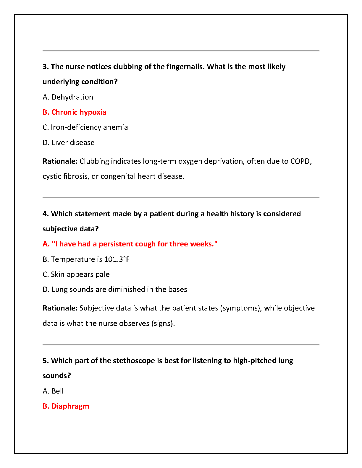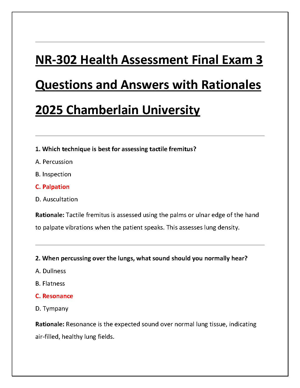 Ace your NR-302 Health Assessment final exam at Chamberlain University with this newly released 2025/2026 test bank. This comprehensive resource contains a full range of questions, verified answers, and detailed rationales for Exam 3, meticulously aligned with the 9th Edition of 'Physical Examination & Health Assessment' by Carolyn Jarvis. This is the ultimate study tool designed to help you master complex concepts, boost your confidence, and pass your exam on the first attempt, ensuring you avoid costly resits and achieve academic success.