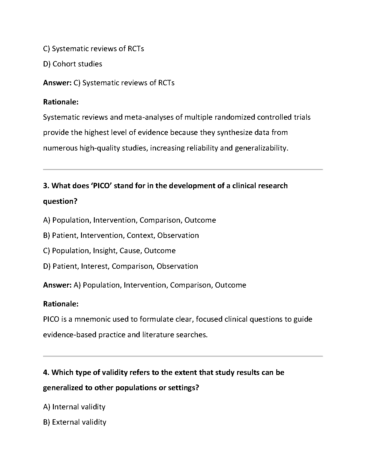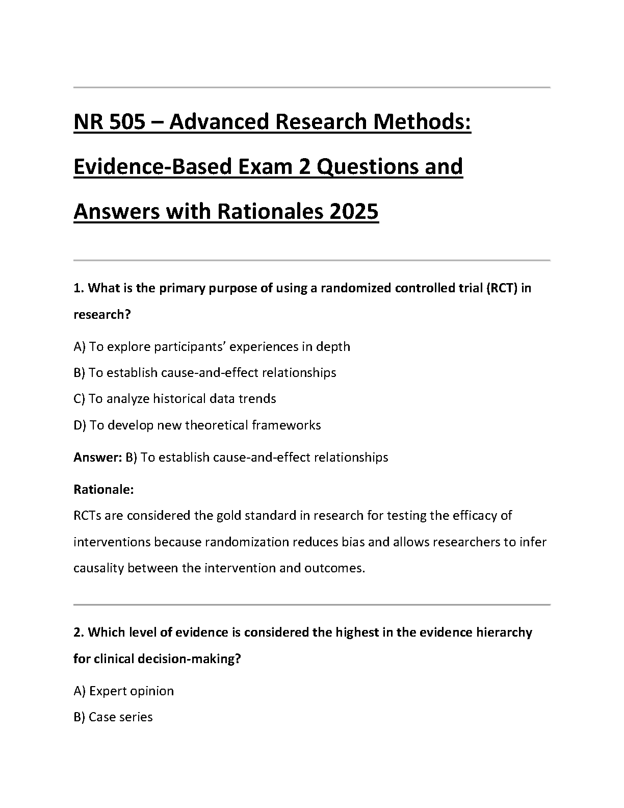 Ace your NR 505 Advanced Research Methods course with the ultimate study resource for Exam 2. This comprehensive test bank for 2025 provides an extensive collection of questions, each paired with a verified answer and in-depth rationale. Deepen your understanding of evidence-based practice, randomized controlled trials, and evidence hierarchies. This guide is expertly crafted to help you master the material, build confidence, and pass your exam on the very first try, eliminating the need for resits.