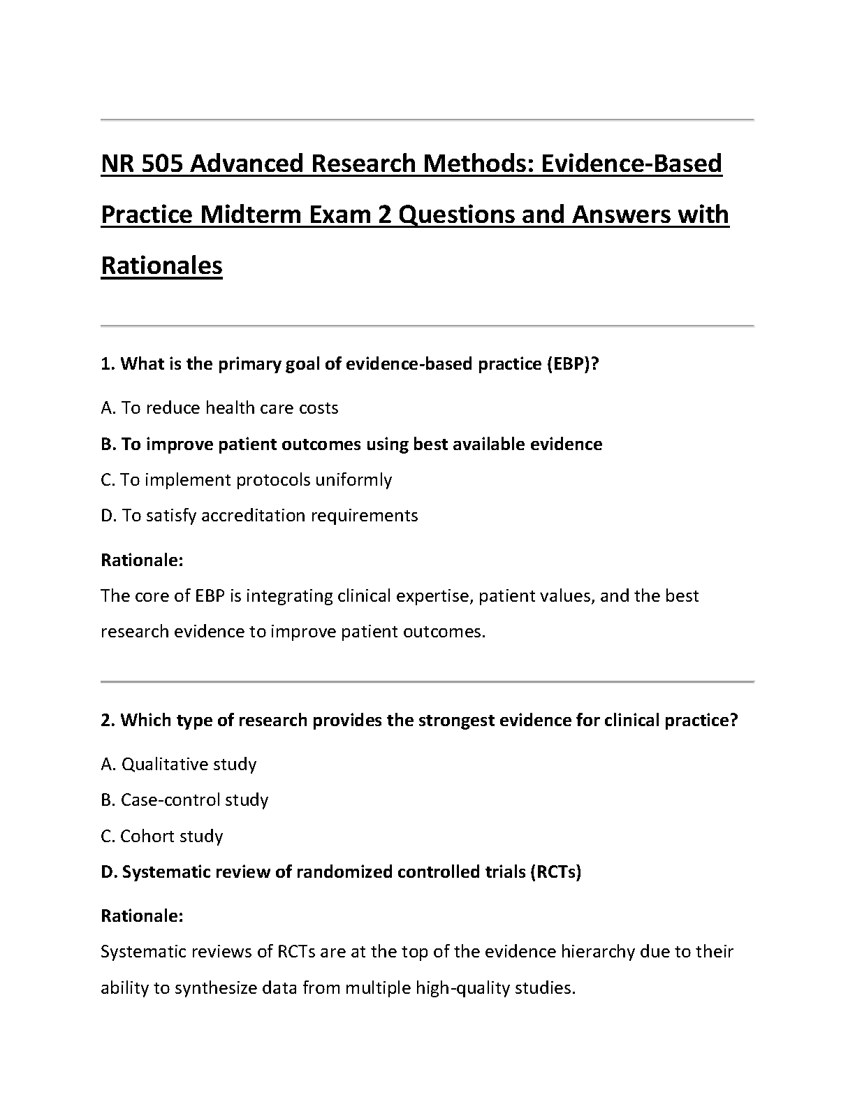 Excel in your nursing studies with this comprehensive test bank for NR 505 Advanced Research Methods: Evidence-Based Practice. This essential study guide contains a complete set of Midterm Exam 2 questions, each paired with a verified answer and a detailed rationale to deepen your understanding. Focus your preparation on key topics and complex concepts to ensure you are fully equipped for success. This resource is expertly designed to help you master the material, build confidence, and pass your exam on the very first attempt, saving you from the stress and cost of resits.