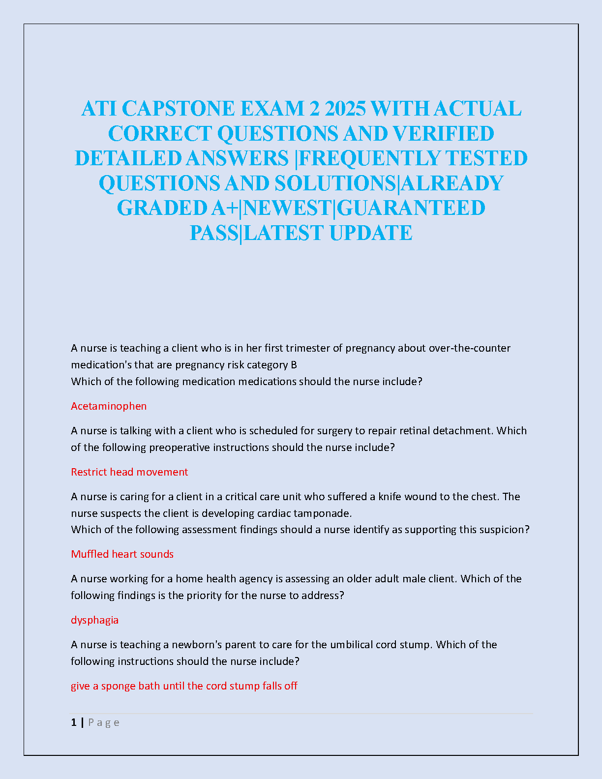 Ace your nursing finals with our latest 2025/2026 ATI Capstone Exam 2 study guide. This comprehensive resource is packed with actual, frequently tested questions and meticulously verified, detailed answers. Designed to help you master critical nursing concepts, this guide is your ultimate tool for achieving an A+ grade and passing your exam on the very first try. Stop worrying about resits and start studying smart with this guaranteed-to-pass, latest update!