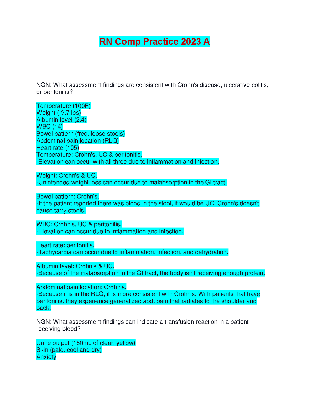Unlock your potential and pass your nursing comprehensive exams with confidence using our latest 2025/2026 RN Comp Practice A guide. This resource provides in-depth exam elaborations specifically tailored for the Next Generation NCLEX (NGN) format. Dive deep into critical topics such as distinguishing between Crohn's disease, ulcerative colitis, and peritonitis, and identifying signs of a transfusion reaction. Each question comes with detailed, easy-to-understand rationales explaining the significance of assessment findings like lab values, vital signs, and patient symptoms. This study guide is meticulously crafted to be the ultimate tool for nursing students aiming to pass their exams on the first try and step into their careers without delay.