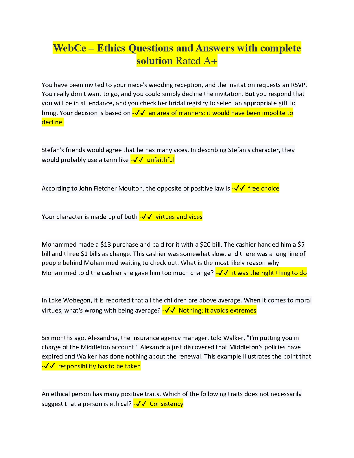WebCe – Ethics Questions and Answers with complete solution Rated A