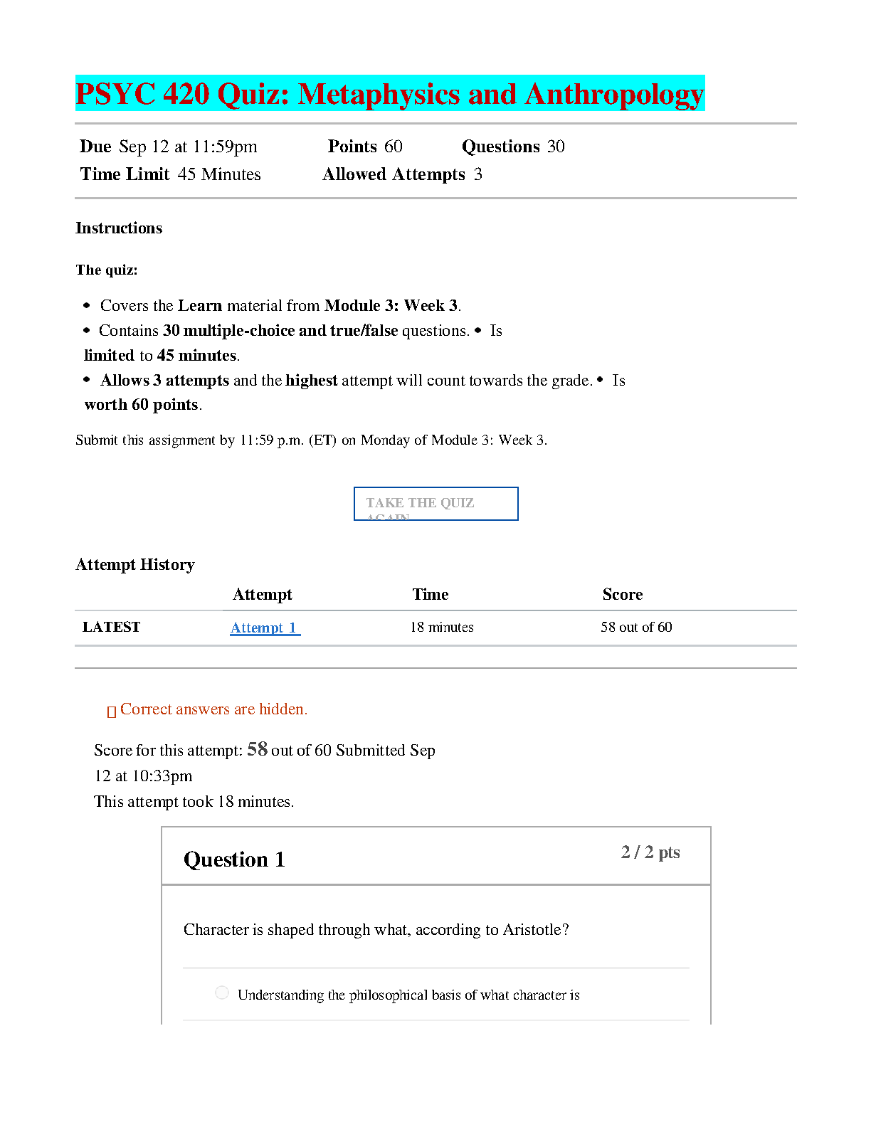 PSYC 420 Module 3 Quiz: Metaphysics and Anthropology | Verified Test Bank with Questions & Detailed Answers