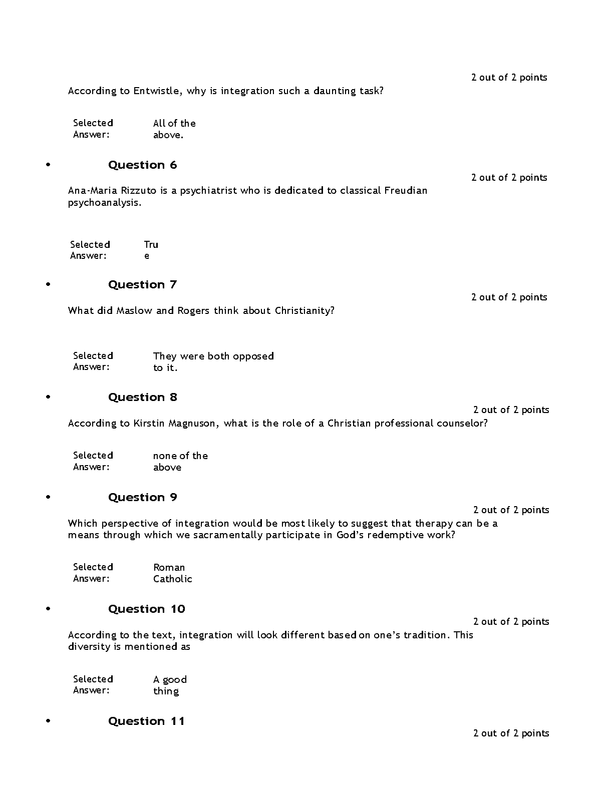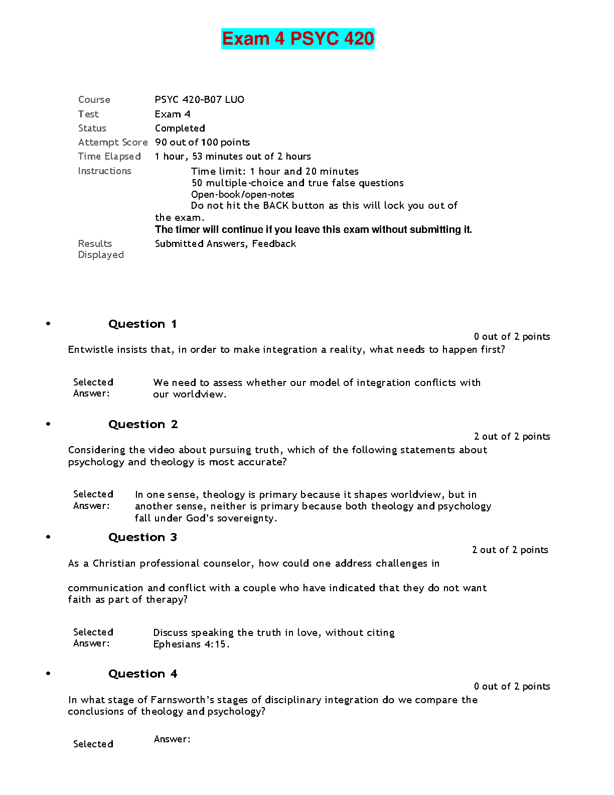 Ace your PSYC 420 Exam 4 with this comprehensive study guide! This resource provides a complete compilation of questions and submitted answers from a recently completed exam, which scored an impressive 90 out of 100. Delve into key topics on the integration of psychology and theology, exploring foundational concepts from Entwistle. This guide is your ultimate tool for understanding the exam format, mastering complex concepts, and ensuring you achieve a top grade. Ideal for students looking to excel in their study of faith and psychology.