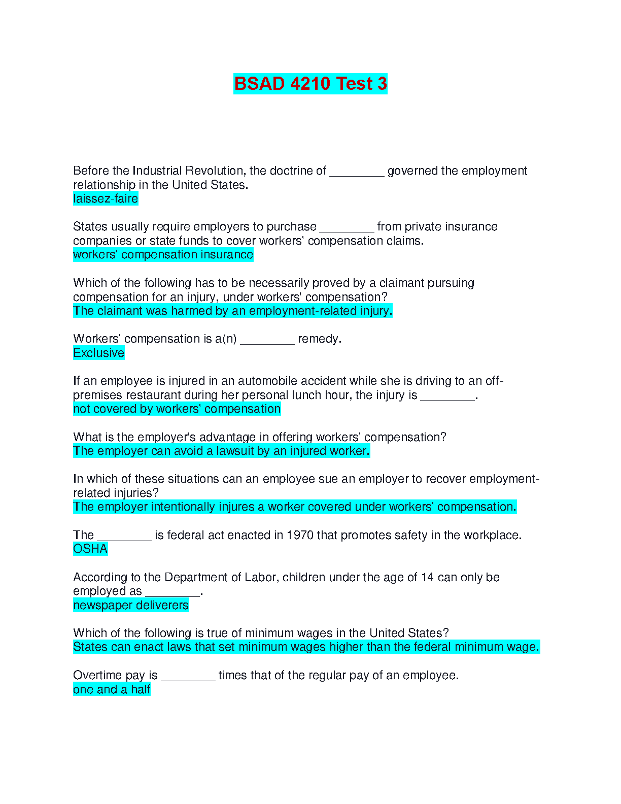 Unlock success in your BSAD 4210 course with this comprehensive Test Bank for Test 3. This essential study guide provides a complete collection of questions with verified, accurate answers, focusing on the critical area of Employment and Labor Law. Master key topics including workers' compensation, OSHA regulations, minimum wage, and the historical doctrines governing employment relationships. This resource is expertly designed to help you thoroughly prepare, test your understanding, and ace your exam with confidence.