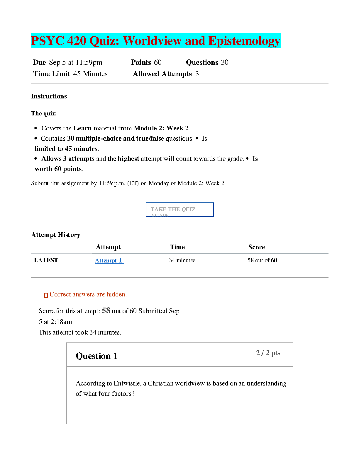 PSYC 420 Test Bank: Worldview and Epistemology Quiz (Module 2), 3rd Edition by David N. Entwistle