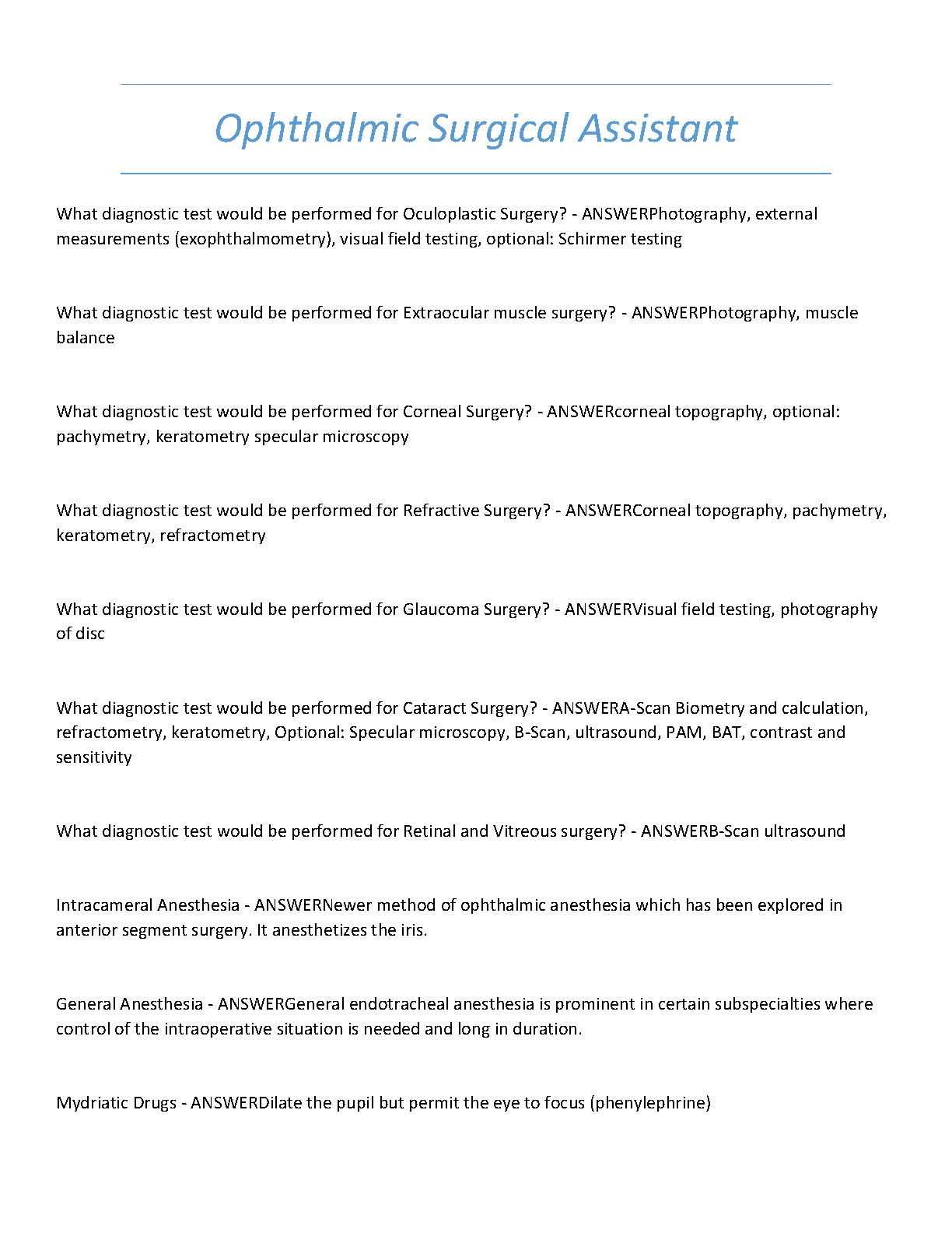 Unlock exam success with our latest 2025/2026 study guide for Ophthalmic Surgical Assistants. This essential resource provides a comprehensive collection of questions and answers, focusing on the critical diagnostic tests required for various ophthalmic procedures including oculoplastic, corneal, glaucoma, and cataract surgeries. Delve into key topics such as anesthesia methods, mydriatic drugs, and pre-operative assessments. This guide is expertly designed to help you master the core concepts, ensuring you pass your certification exams with confidence and avoid resits.