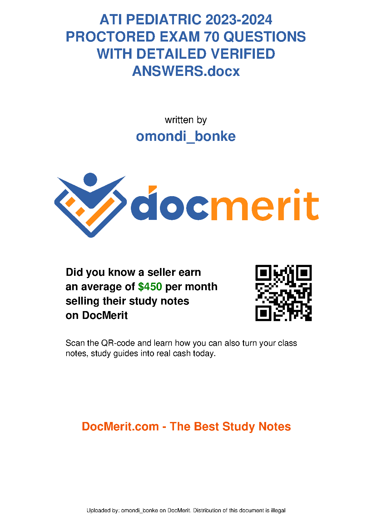 Ace your ATI Pediatric Proctored Exam with our latest 2025/2026 A+ study guide. This comprehensive resource features 70 meticulously crafted questions, each with a detailed and verified answer. Designed specifically to help nursing students master pediatric concepts, this guide is your ultimate tool for achieving a top score and passing on your first attempt. Stop worrying about resits and start studying smart with our proven success materials.