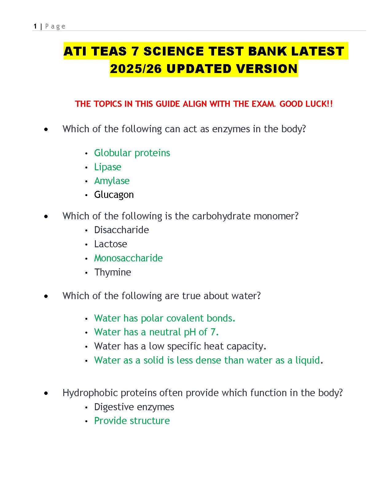 Excel in the Science section of your nursing entrance exam with the latest ATI TEAS 7 Science Test Bank for the 2025/2026 academic year. This comprehensive resource provides a complete collection of exam-style questions paired with thoroughly verified answers. Master key concepts in human anatomy and physiology, life and physical sciences, and scientific reasoning. This test bank is designed to align perfectly with the current exam curriculum, ensuring you study the most relevant material. Boost your confidence, identify your weak points, and prepare effectively to pass the TEAS 7 on your first attempt.