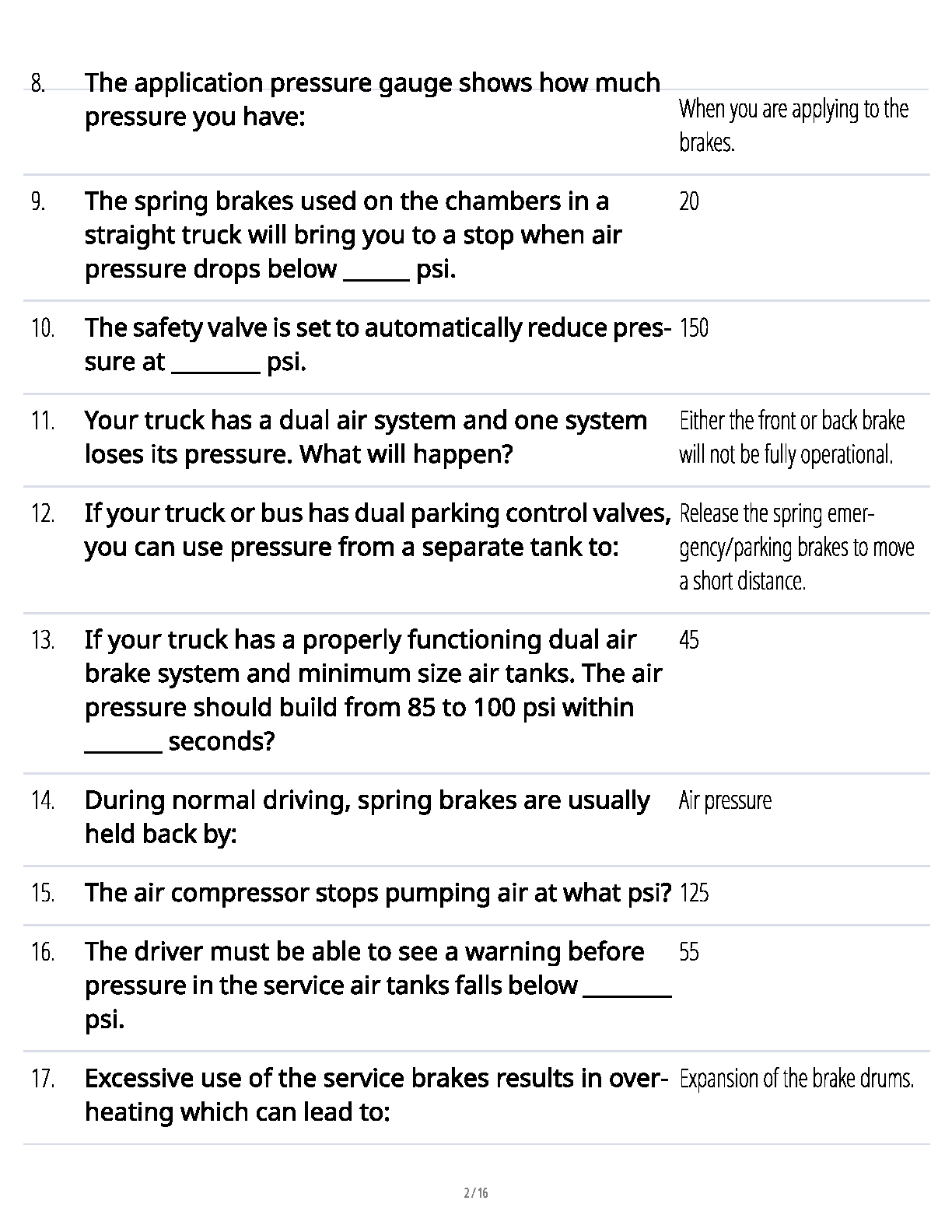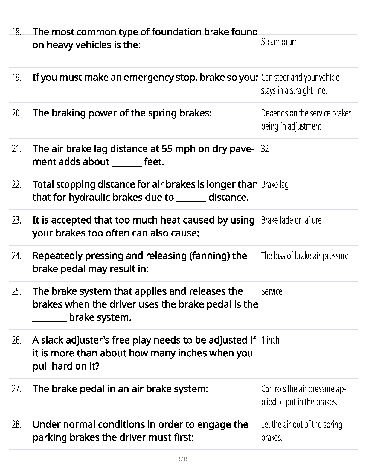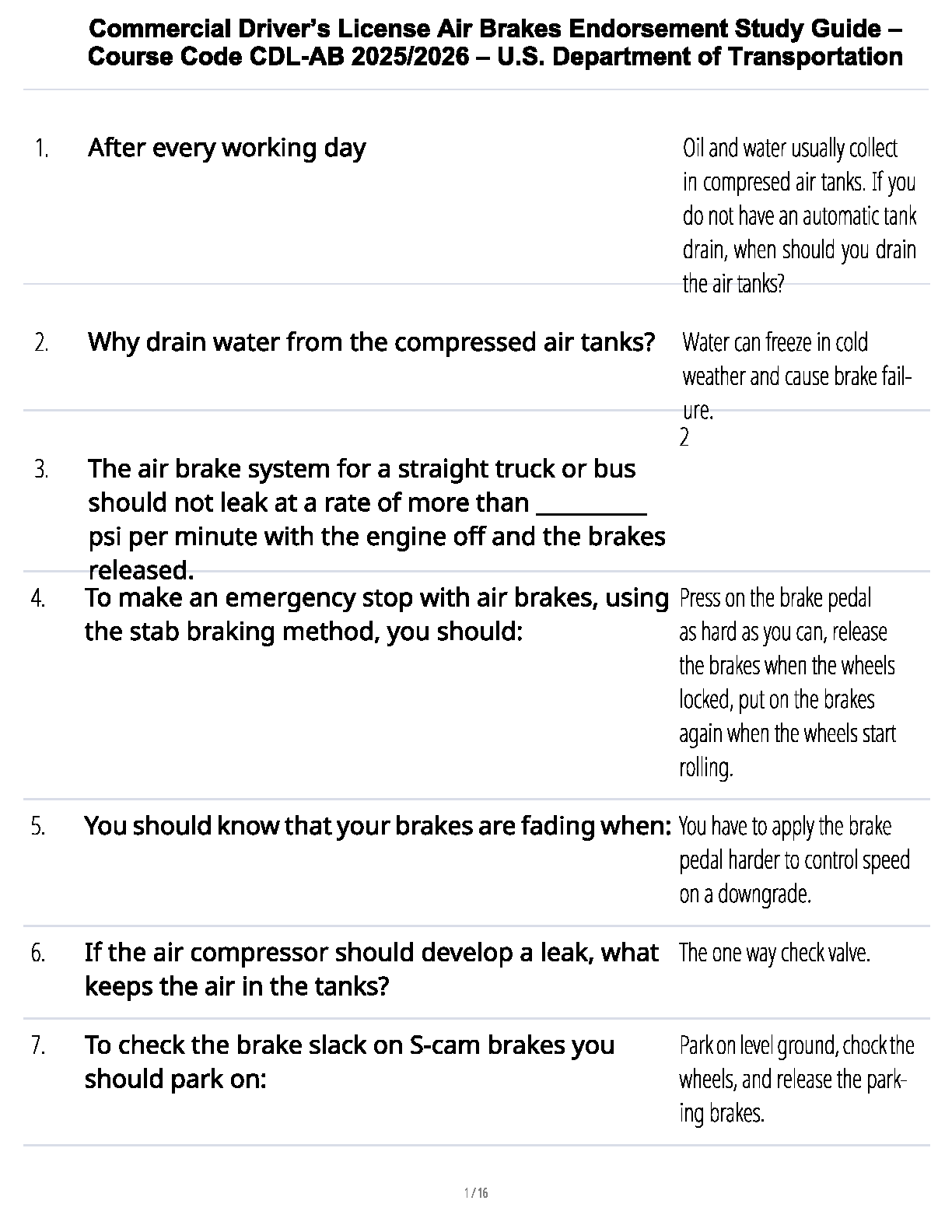 Ace your Commercial Driver's License (CDL) Air Brakes Endorsement exam on the first attempt with this comprehensive 2025/2026 test bank. Sourced directly from U.S. Department of Transportation guidelines, this study guide provides a complete set of exam-style questions and 100% verified answers. Master essential topics such as air tank maintenance, leak detection, stab braking techniques, identifying brake fade, and proper slack adjustment. This up-to-date resource is your key to understanding complex air brake systems and passing the test with confidence, avoiding costly resits.