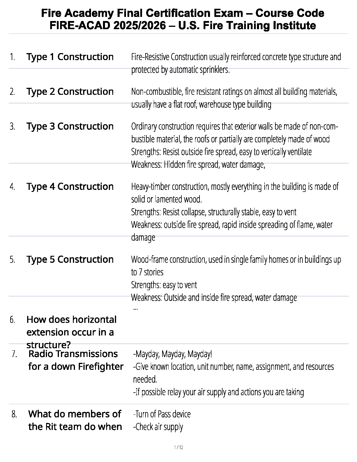Prepare to excel in your firefighter certification with this essential test bank for the Fire Academy Final Exam (Course Code: FIRE-ACAD), updated for the 2025/2026 academic year. This comprehensive Q&A guide from the U.S. Fire Training Institute covers all critical exam topics, including the 5 types of building construction, fire dynamics like horizontal extension, vital 'Mayday' radio transmissions for a downed firefighter, and the operational duties of a Rit team. This study resource is expertly crafted to ensure you master the material, build confidence, and pass your final certification on the first attempt, securing your future in the fire service.