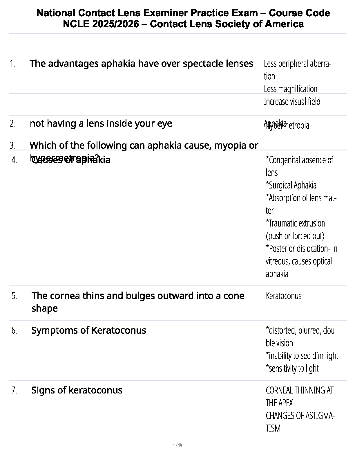 Prepare to excel on your National Contact Lens Examiner (NCLE) exam with our comprehensive 2025/2026 Practice Exam Test Bank. Developed by the prestigious Contact Lens Society of America, this study guide is meticulously crafted with the latest questions and detailed answers to cover all essential topics. This resource is your ultimate tool to build confidence, master complex concepts like aphakia and keratoconus, and ensure you pass the NCLE on your very first attempt. Avoid resits and fast-track your career with this up-to-date and essential exam preparation material.