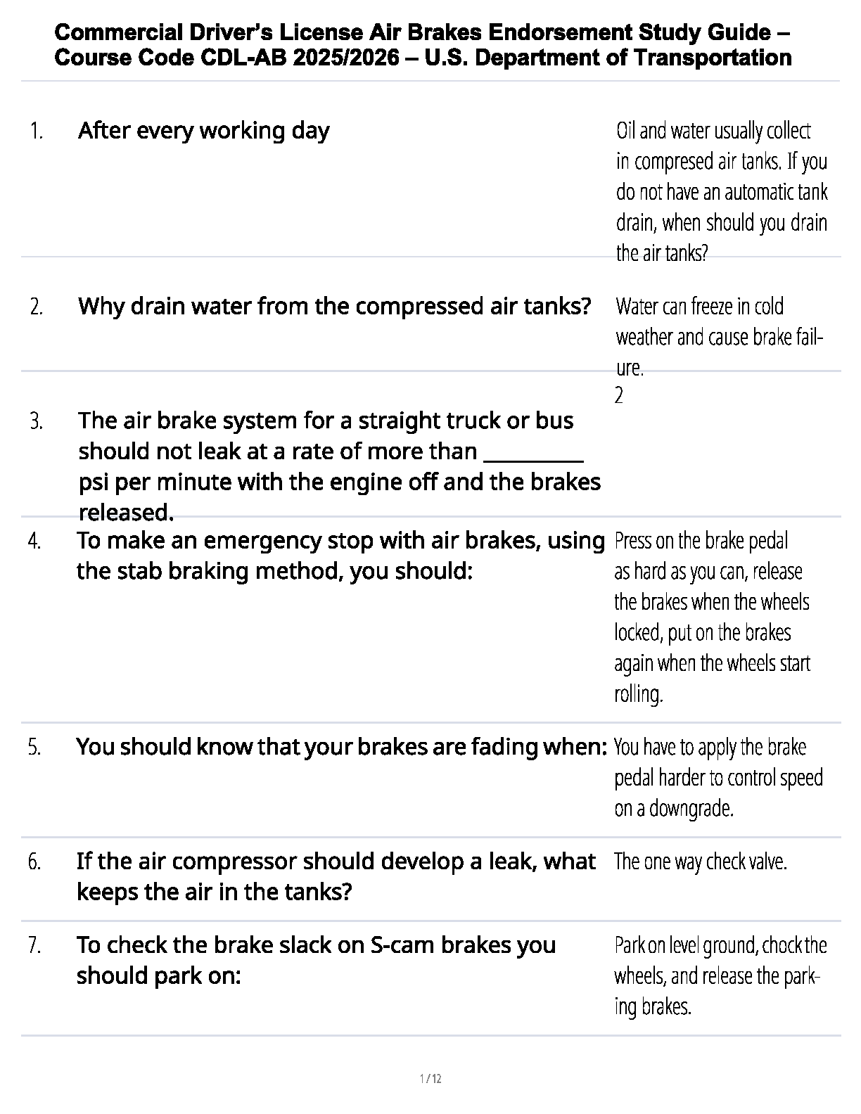 Get ready to ace your Commercial Driver's License (CDL) Air Brakes Endorsement exam with our comprehensive study guide for the 2025-2026 season. This resource, based on official materials from the U.S. Department of Transportation, provides a complete set of questions and detailed answers covering all critical topics. Learn everything you need to know about system maintenance, emergency procedures like stab braking, identifying brake fade, and checking brake slack. This is the ultimate tool to ensure you pass your test on the first attempt and avoid costly resits. Download now and drive your career forward!
